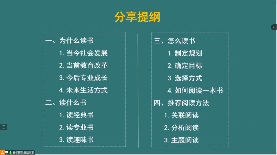 本次培训由杨朝晖老师做《读万卷书,行万里路——浅谈读书与成长》主题讲座,围绕“为什么读书”、“读什么书”、“怎么读书”以及“推荐阅读方法”四方面展开。讲座伊始,杨朝晖老师提出“好读书,读好书”,并依次阐述了要读书的原因:读书对于当今社会发展是种必备;读书对于当前教育改革是种责任;读书对于今后人生成长是种必需;读书对于未来生活方式是种乐趣。随后,杨朝晖老师建议学员们读经典书、专业书和趣味书,其中着重从毕业前、毕业时、毕业后三个阶段讲述了读专业书的意义和应该阅读的种类,为日后学员的阅读指明了方向。最后,杨朝晖老师介绍了怎么读书,提醒学员们要将短期阅读与长期阅读相结合、确定目标与实现目标相结合、纸质阅读与听书相结合,并详细讲述了阅读一本书的方法。除此之外,杨朝晖老师还向学员们推荐了三种阅读方法,即关联阅读、深度阅读和主题阅读,希望学员可以合理运用,以此提高阅读质量及效率。