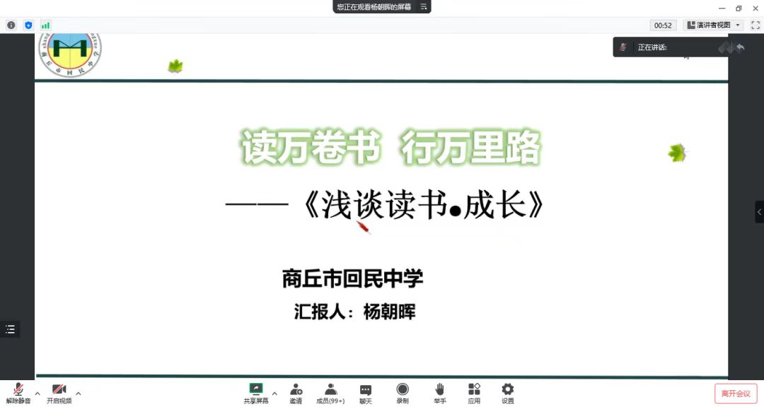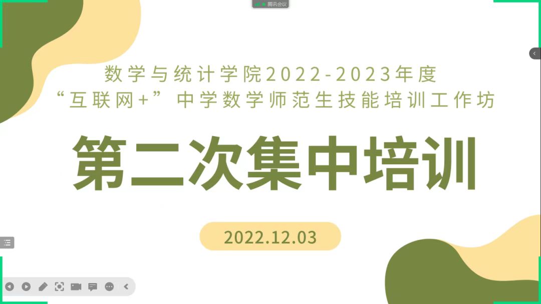 为进一步提升师范生的教学技能,全面提高师范生的专业素养,金年会jinnianhuicom于12月3日晚七点在腾讯会议上开展了“互联网+”中学数学师范生技能培训工作坊第二次集中培训——浅谈读书·成长专题讲座。此次培训由商丘市回民中学杨朝晖老师主讲,中学数学工作坊11位坊主,金年会jinnianhuicom院长张斐然、副院长刘磊、2020级辅导员姜素华以及2020级111位师范生参加了此次集中培训。