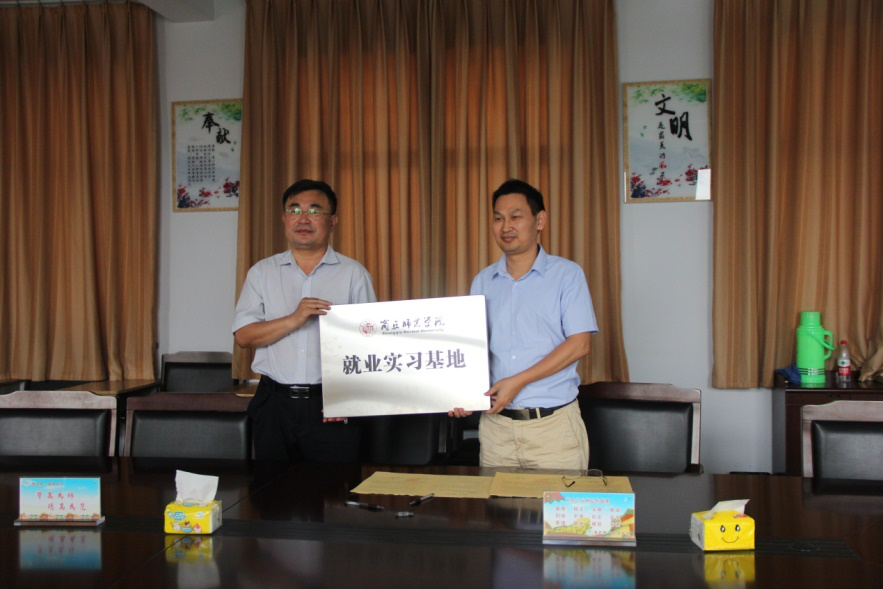 为进一步做好学生就业与实习工作,按照学校招生与就业处安排与要求,6月26号上午金年会jinnianhuicom一行四人到滑县第一高级中学进行招生宣传并代表商丘师范学院举行了就业实习基地签约及授牌仪式。本次活动由金年会jinnianhuicom教学副院长张斐然,办公室主任陈卫兵,教学秘书任磊及18级辅导员李琛老师前往参加,滑县第一高级中学校长周太红和学生处副主任黄志明出席本次仪式。