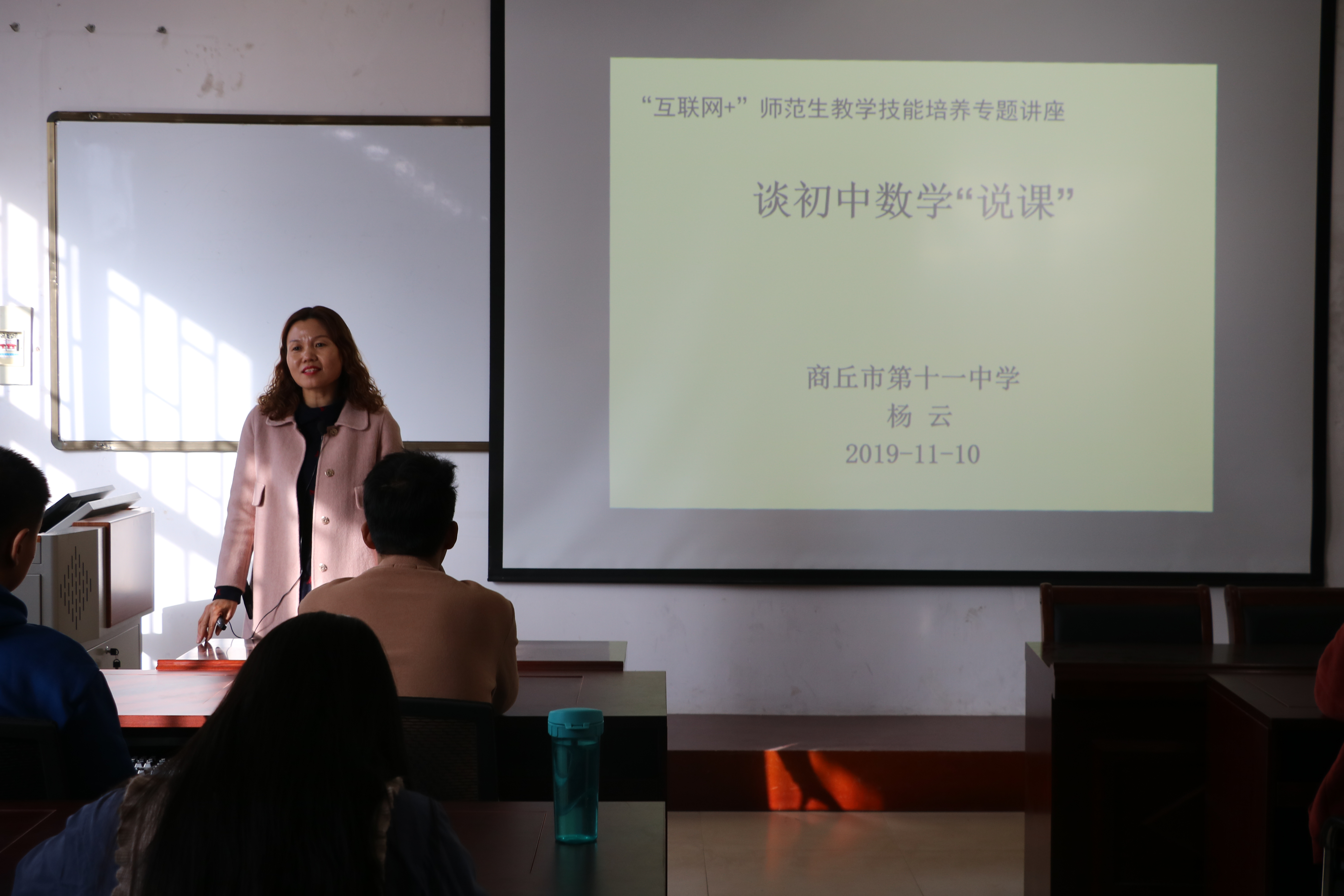 为切实提高师范生的说课能力,11月10日上午九点金年会jinnianhuicom“互联网+师范生技能培养”专题讲座之谈初中数学“说课”在睢阳校区办公楼二楼208教室举行。本次活动由金年会jinnianhuicom副院长张斐然,工作坊负责人姜素华、黄丽芝老师及商丘市实验中学刘菲老师出席,全体坊员参加。讲座由商丘市第十一中学教学名师杨云老师主讲。
