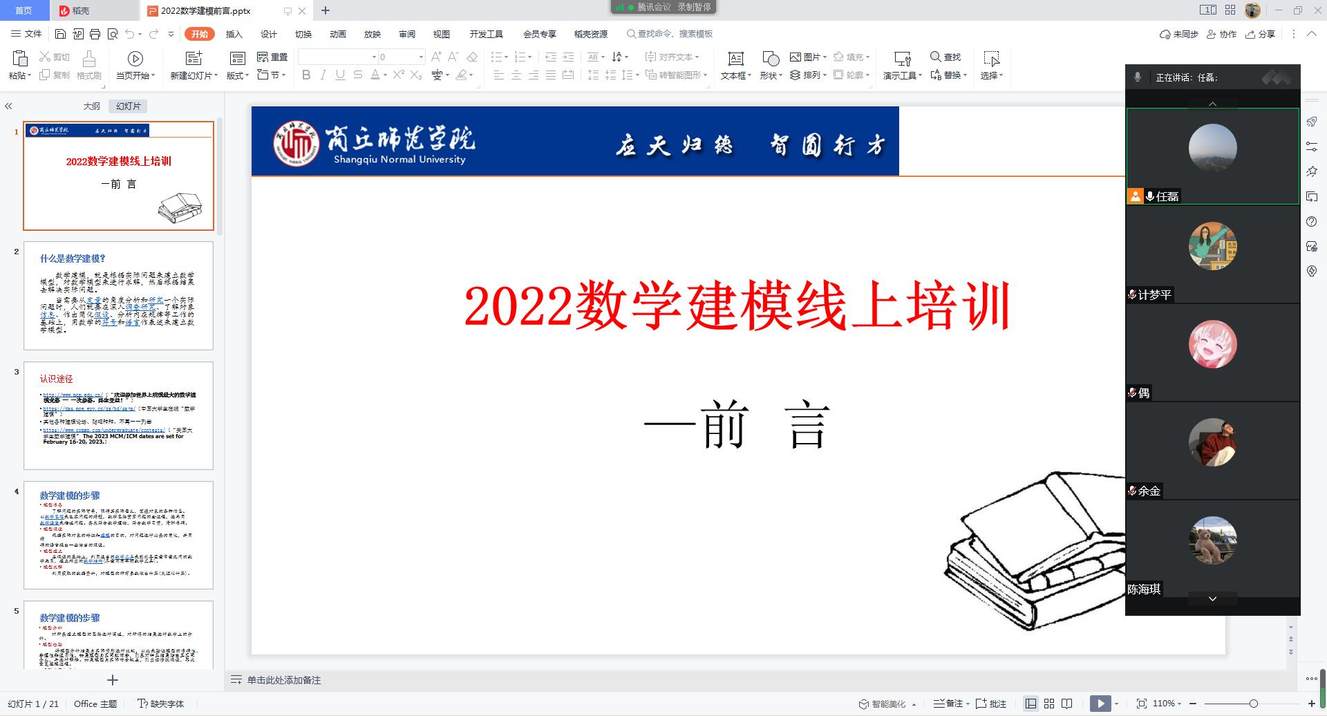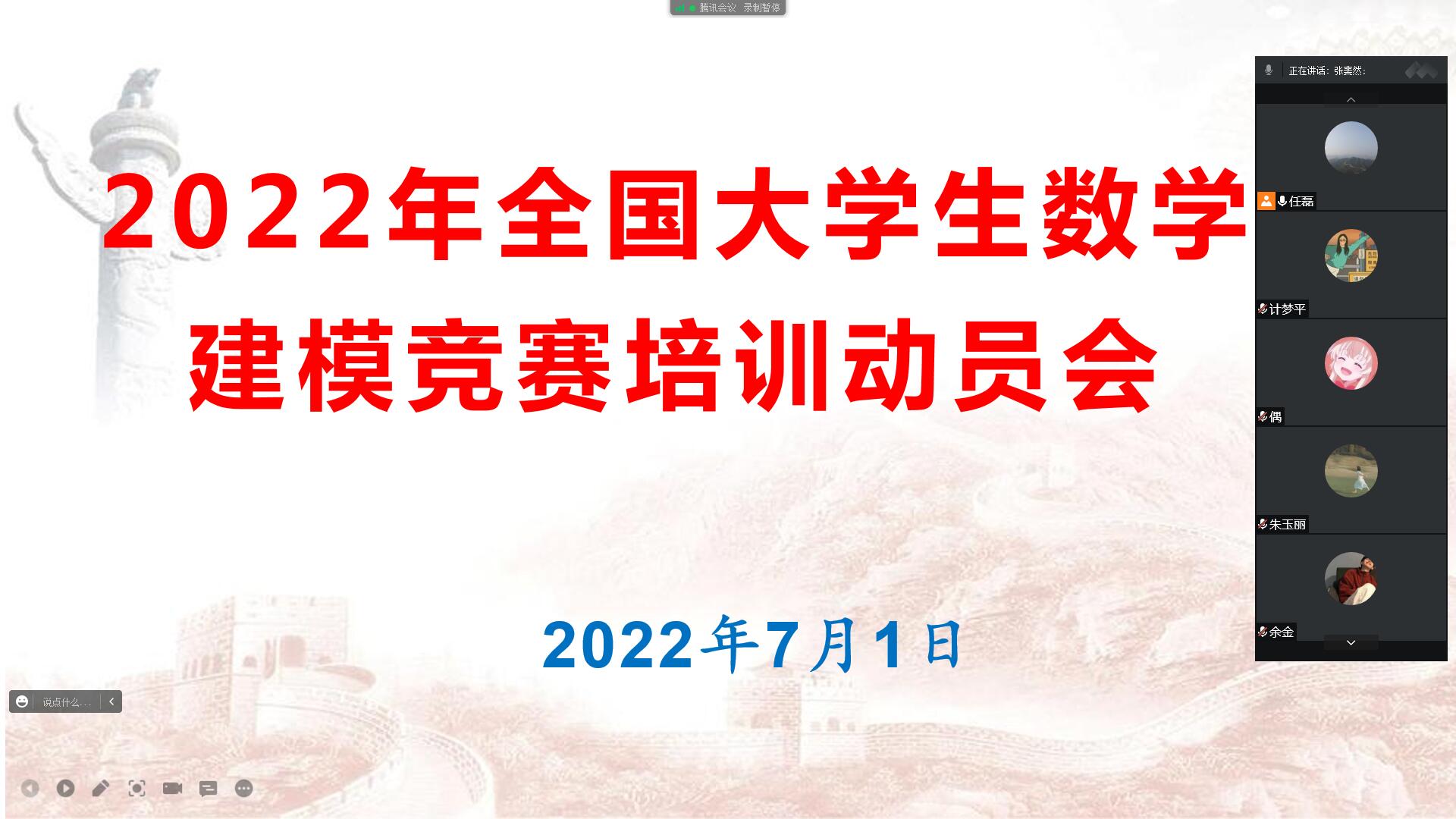 7月1日,2022年全国大学生数学建模竞赛动员大会通过线上腾讯会议的形式顺利举行,金年会jinnianhuicom院长张斐然、副院长刘磊 、数学建模全体指导老师以及来自金年会jinnianhuicom、电子电气工程学院、化学化工学院、信息技术学院、经济管理学院、测绘与规划学院、建筑工程学院、国际教育学院等261名参赛队员参会,会议由刘磊主持。