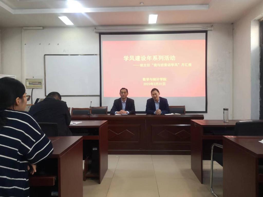 为了进一步加强金年会学生学风建设,促使学生端正学习态度,提升学生综合素质,3月27日、3月31日,金年会jinnianhuicom在数学楼二楼会议室开展了“我与舍友话文明”、“我与班委话学风”开展情况月汇报活动,学院领导班子、全体辅导员、班主任参加。