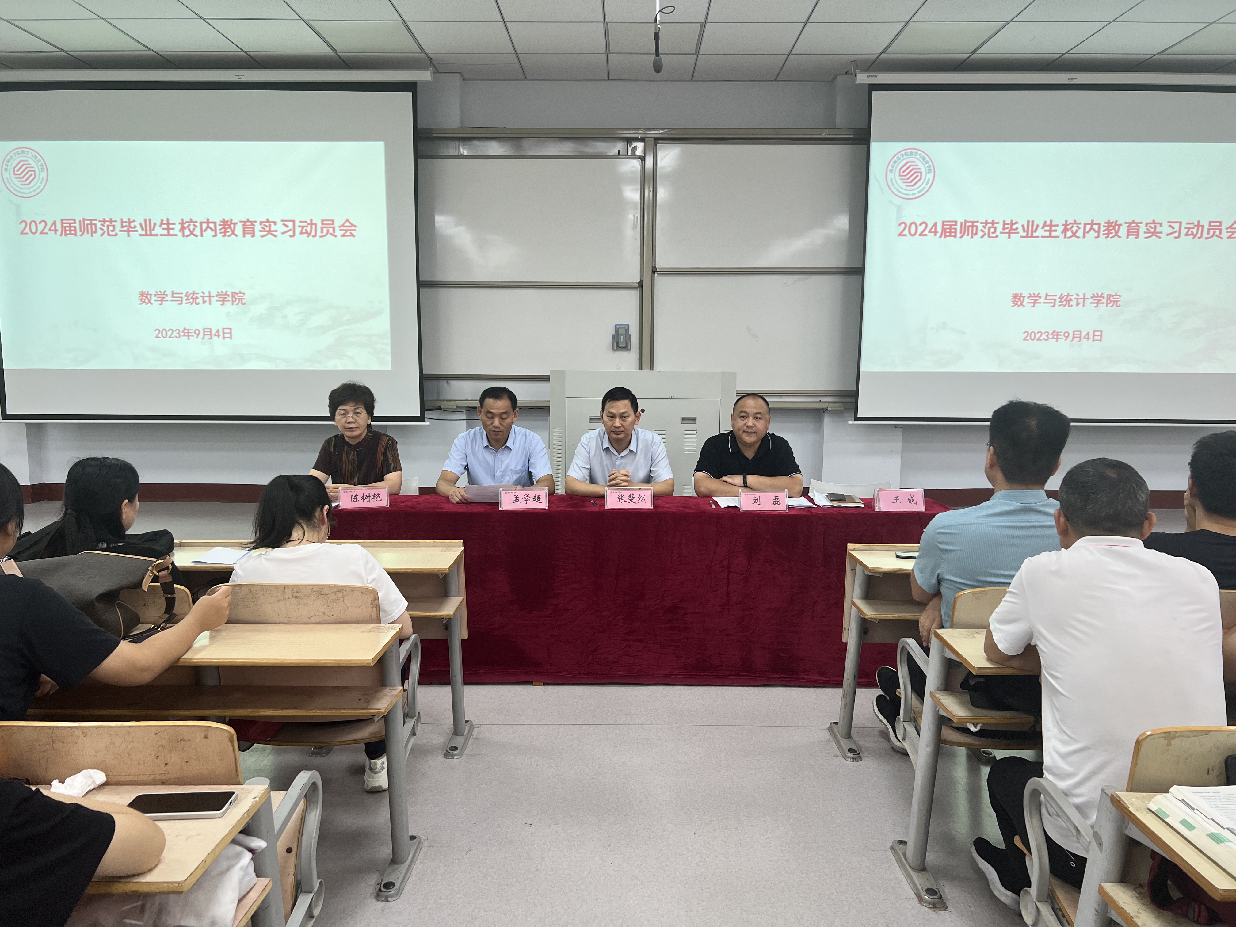 为了扎实做好2024届本科毕业生的教育实习工作,进一步促进学生对所学知识和技能进行实践运用,引导学生明确认识实习的目的和意义。9月4日金年会jinnianhuicom在一号教学楼208教室召开了2024届本科毕业生教育实习动员大会。学院党委书记孟学超、院长张斐然、副院长刘磊、教育实习指导老师以及2020级数学与应用数学专业全体学生参加了会议。会议由学院党委副书记陈树艳主持。
