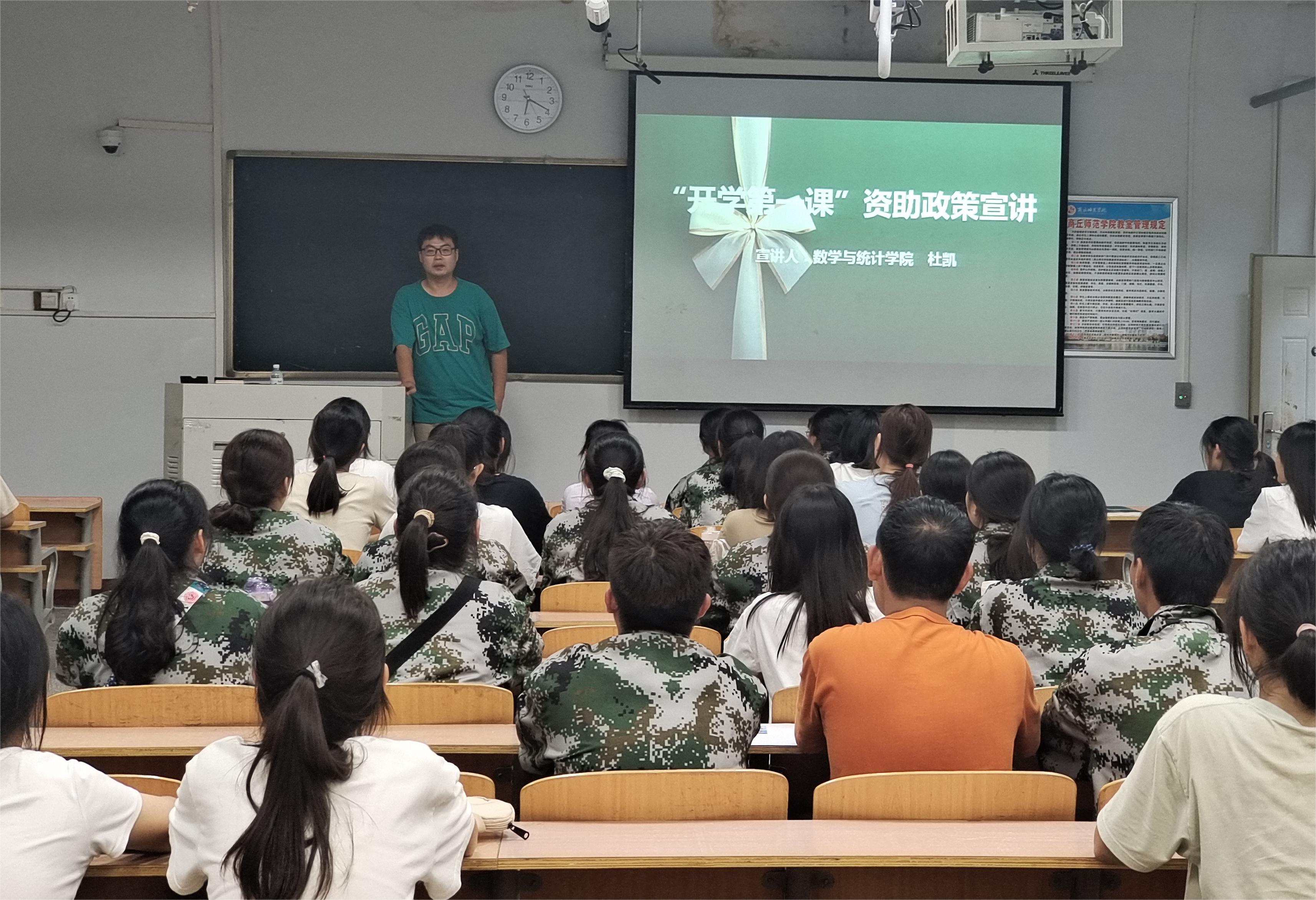 为进一步加大大学生资助政策宣传力度,充分发挥资助育人功能,2023年9月13日,金年会jinnianhuicom2023级辅导员杜凯老师莅临2023级各班,结合学校实际情况,为大家开展了主题为“大学生资助政策宣讲”的开学第一课,充分发挥了政策传播与励志引领作用。