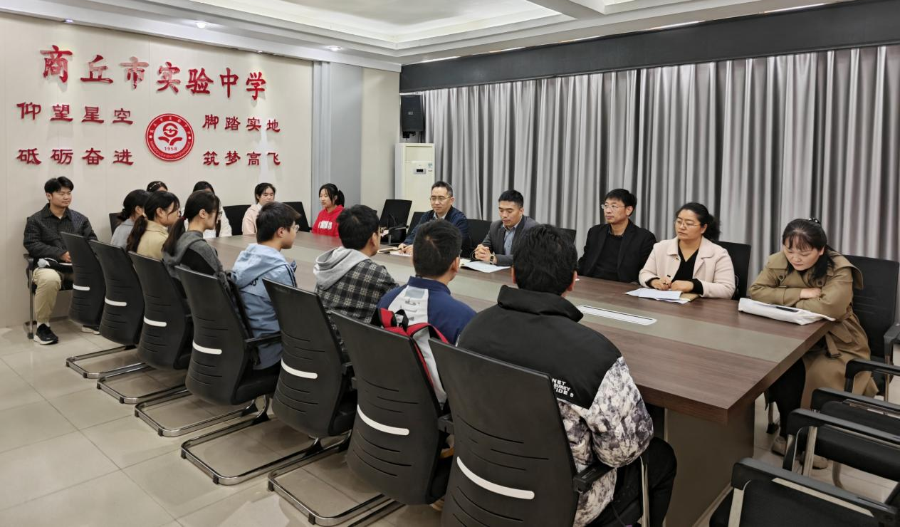 2024 年10月22日上午,金年会jinnianhuicom副院长任磊、21级辅导员黄丽芝带领2025届师范毕业生赴商丘实验中学开展校外实习活动。商丘市实验中学教务处曹申军主任、田淏主任对金年会jinnianhuicom领导、老师及同学们的到来表示热烈欢迎。