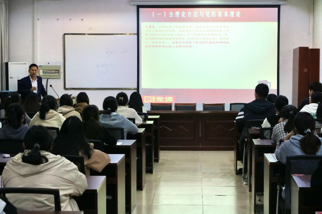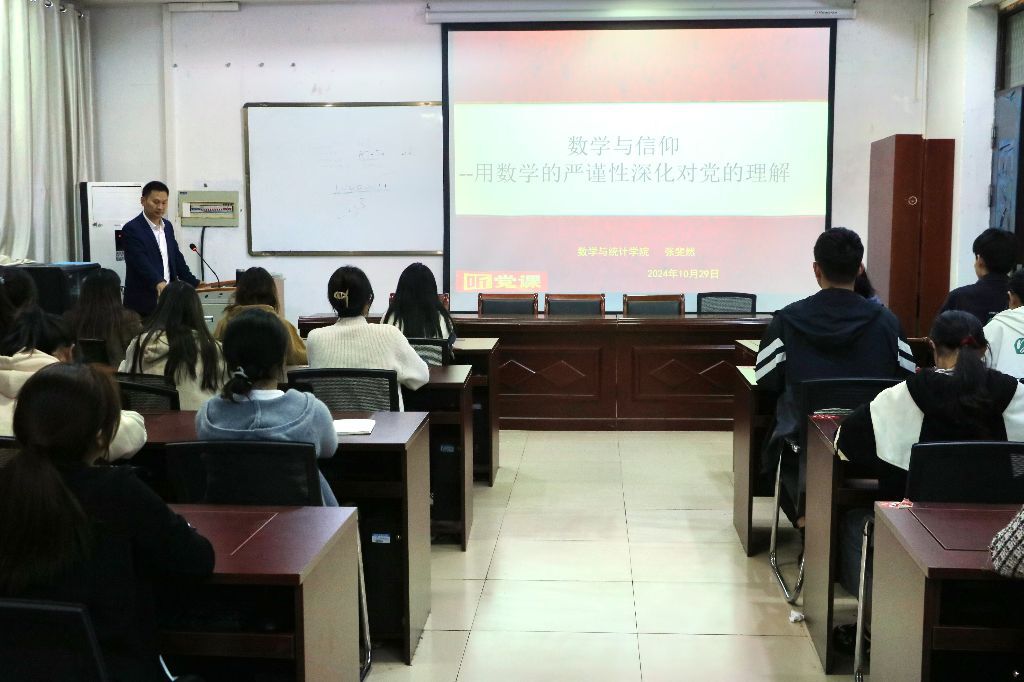 为加强入党积极分子对党的认识和理解,进一步坚定理想信念,金年会jinnianhuicom于10月29日在办公楼208教室开展了以“数学与信仰——用数学的严谨性深化对党的理解”为主题的党课培训。本次党课由金年会jinnianhuicom院长张斐然主讲,全体中级入党积极分子参加。
