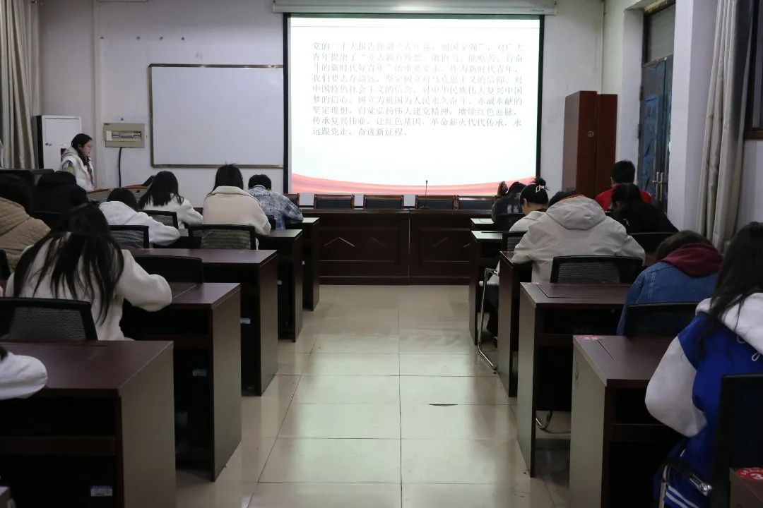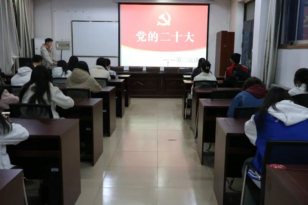 2023年4月24日晚上7点,金年会jinnianhuicom在睢阳校区办公楼208会议室开展学习贯彻党的二十大精神专题宣讲活动。各宣讲团采用视频、PPT、演讲等不同形式由浅入深,以学习贯彻习近平新时代中国特色社会主义思想、党的二十大精神为主题,通过青年角度、青年语言、青年方式向同学们宣讲党的二十大精神,使得同学对于党史精神入脑入心,行成于思。