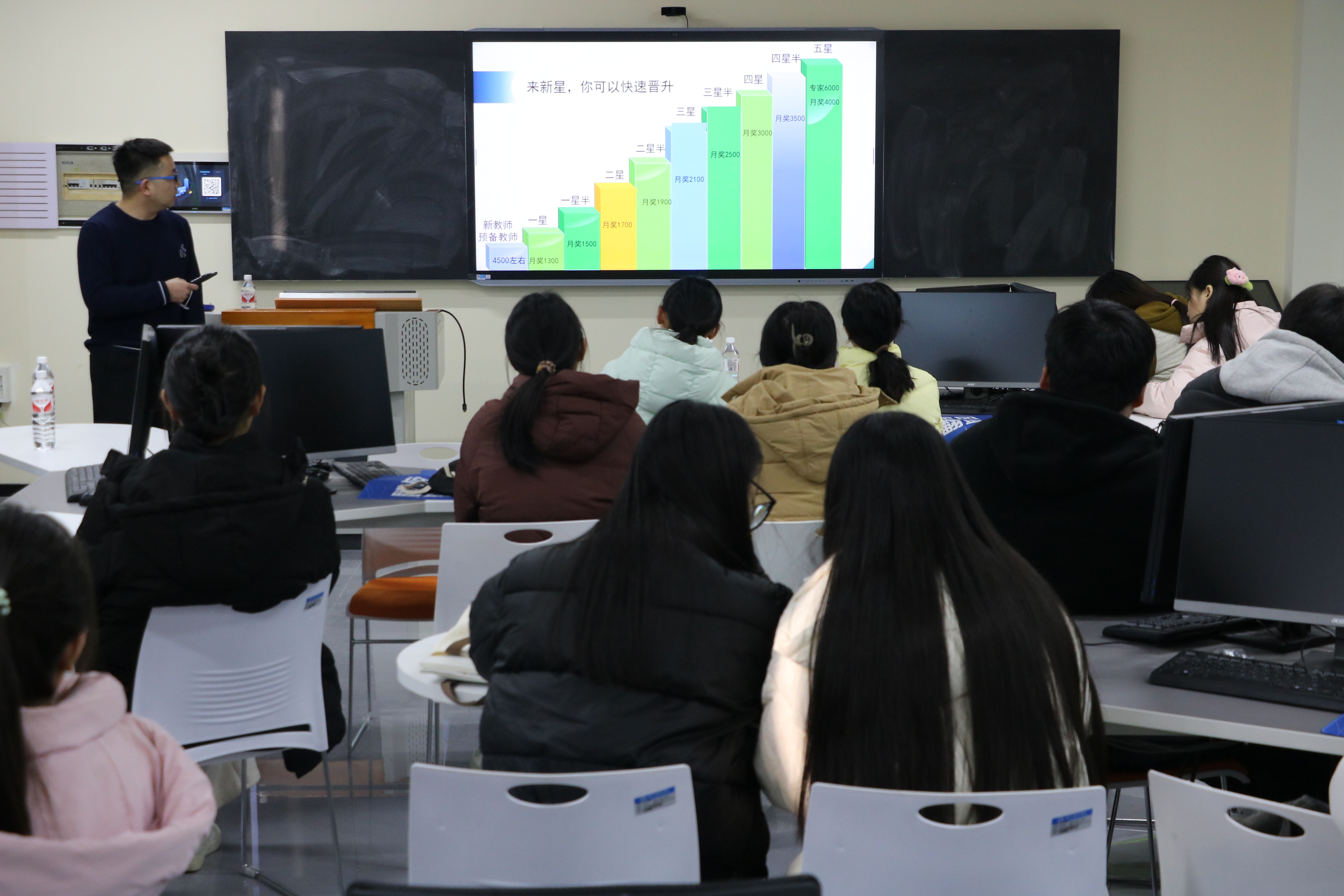 活动伊始,周口新星学校的相关负责人进行了自我介绍,并通过生动的讲解和精彩的展示,详细介绍了学校的概况。从学校的发展历程和学校地位到学校的办学理念,全方位地展现了学校的整体风貌。随后,他深入阐述了学校的优势,包括经验丰富的教师团队、优厚的福利待遇以及学校为教师提供的广阔发展空间和良好的教学环境,吸引了在场的同学们。最后,周口新星学校的相关负责人与同学们展开了积极互动。同学们踊跃提问,负责人耐心细致地一一作答,为同学们拨开迷雾,增强了同学们对该校就业岗位的兴趣与信心。