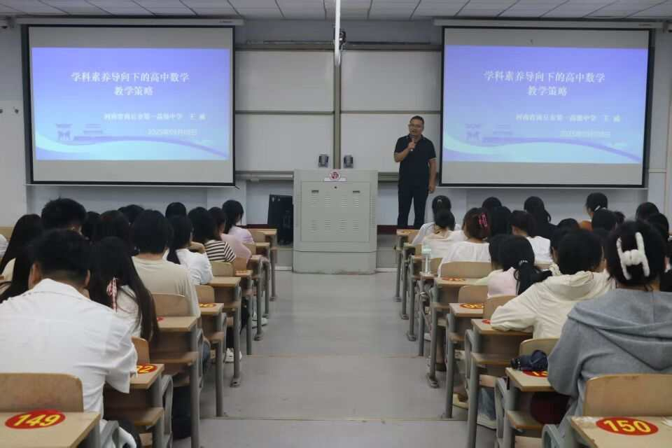 第二阶段,由商丘市第一高级中学教学名师王威给大家带来了一场精彩的报告。他结合高中数学教学实例,分享了如何根据学生学情设计课堂环节、如何通过互动提问激发学生学习兴趣、如何应对课堂突发情况等技巧,让在场学生对高中数学教学的实际场景有了更直观、深刻的认知,为后续实习授课提供了宝贵参考。