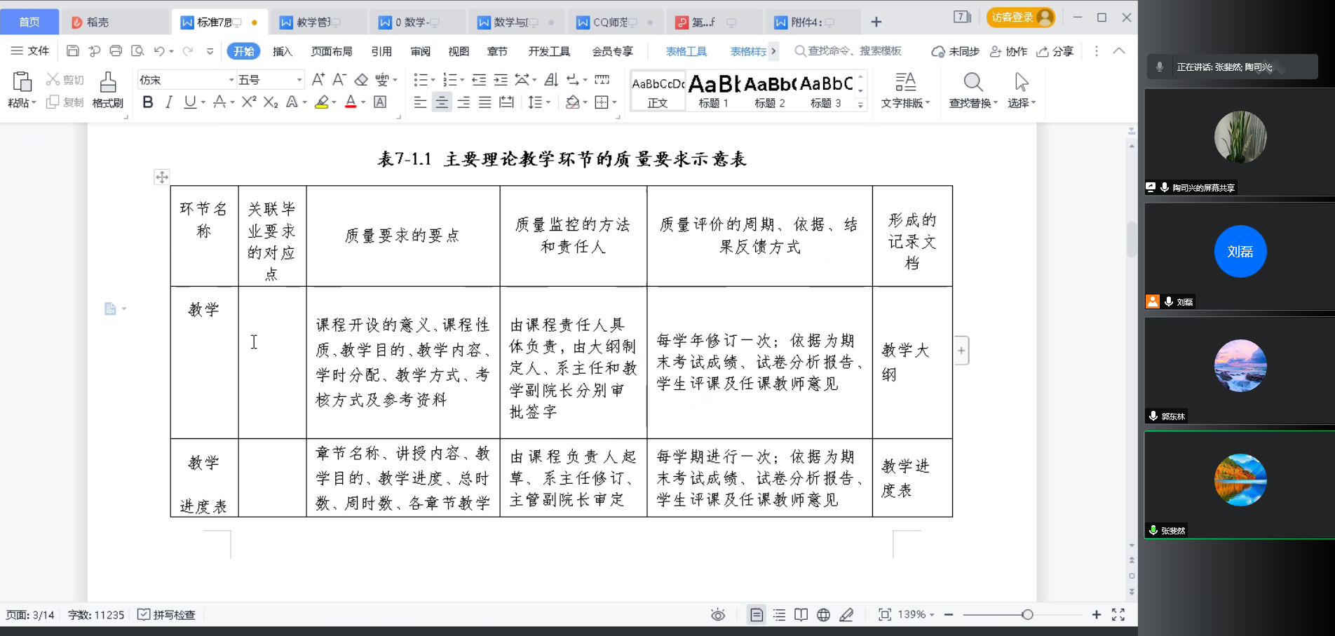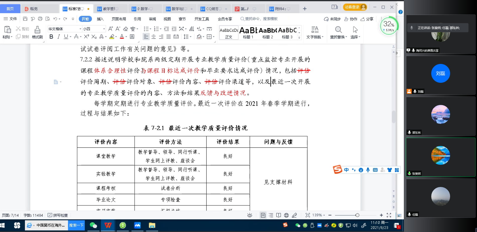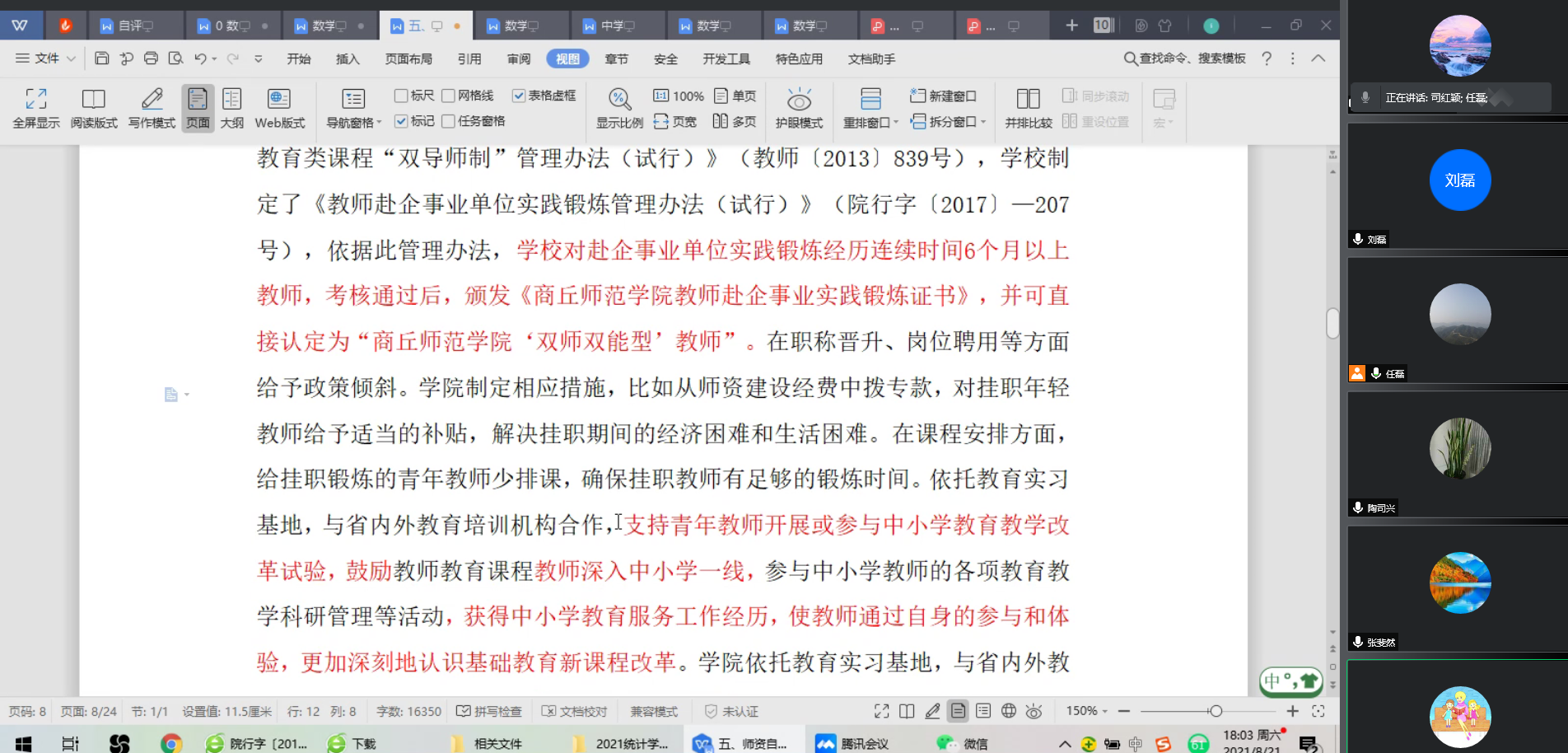 扎实推进“数学与应用数学”师范专业认证工作,做好认证自评和认证准备,8月18日至24日,金年会jinnianhuicom院长张斐然、副院长刘磊、各教研室主任、撰写小组成员、材料组成员借助腾讯会议线上持续进行了师范专业认证自评报告的审核、修改工作。