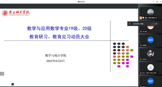 根据人才培养方案和教学计划的安排,金年会jinnianhuicom于2022年6月6日召开了2020级教育见习和2019级教育研习线上动员会,宣布教育见习和研习的工作实施方案,安排部署教育教育见习和研习的相关事宜,本次活动有刘磊院长主持,数学与应用数学专业2019级与2020级全体学生及指导教师参加。