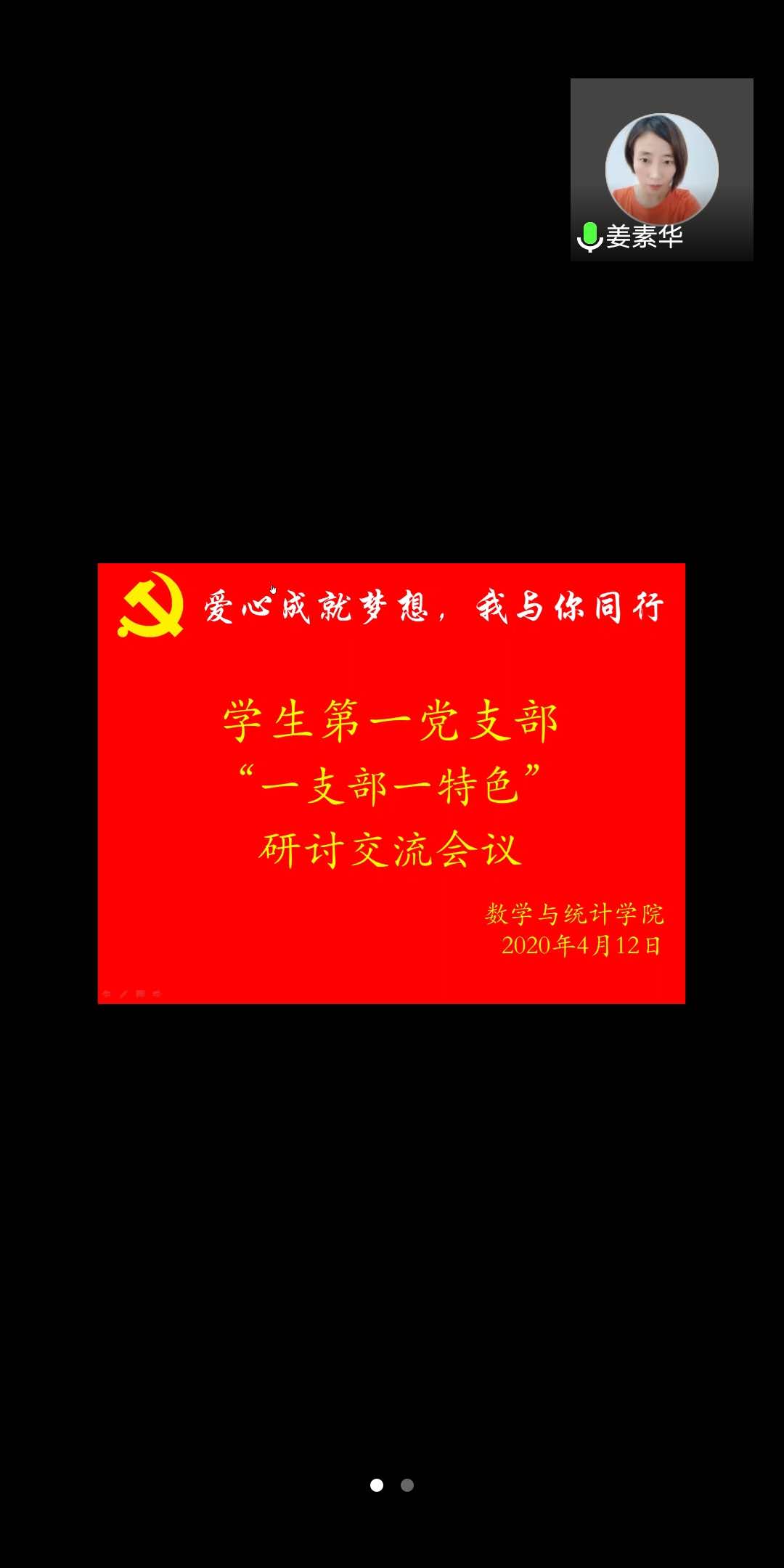 为发扬党员服务精神,发展党支部特色活动。金年会jinnianhuicom学生第一党支部于2020年4月12日开展线上“一支部一特色”研讨交流会。学生第一党支部全体党员同志参加,会议由学生党支部书记姜素华老师主持。