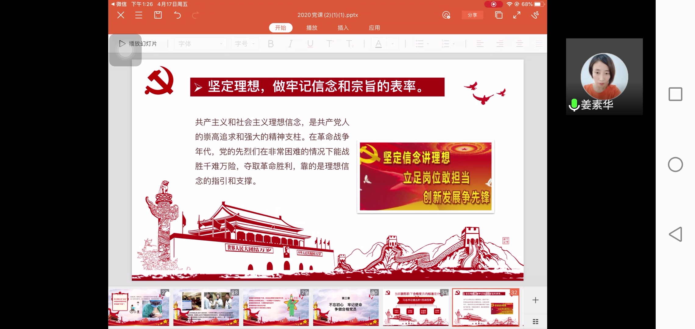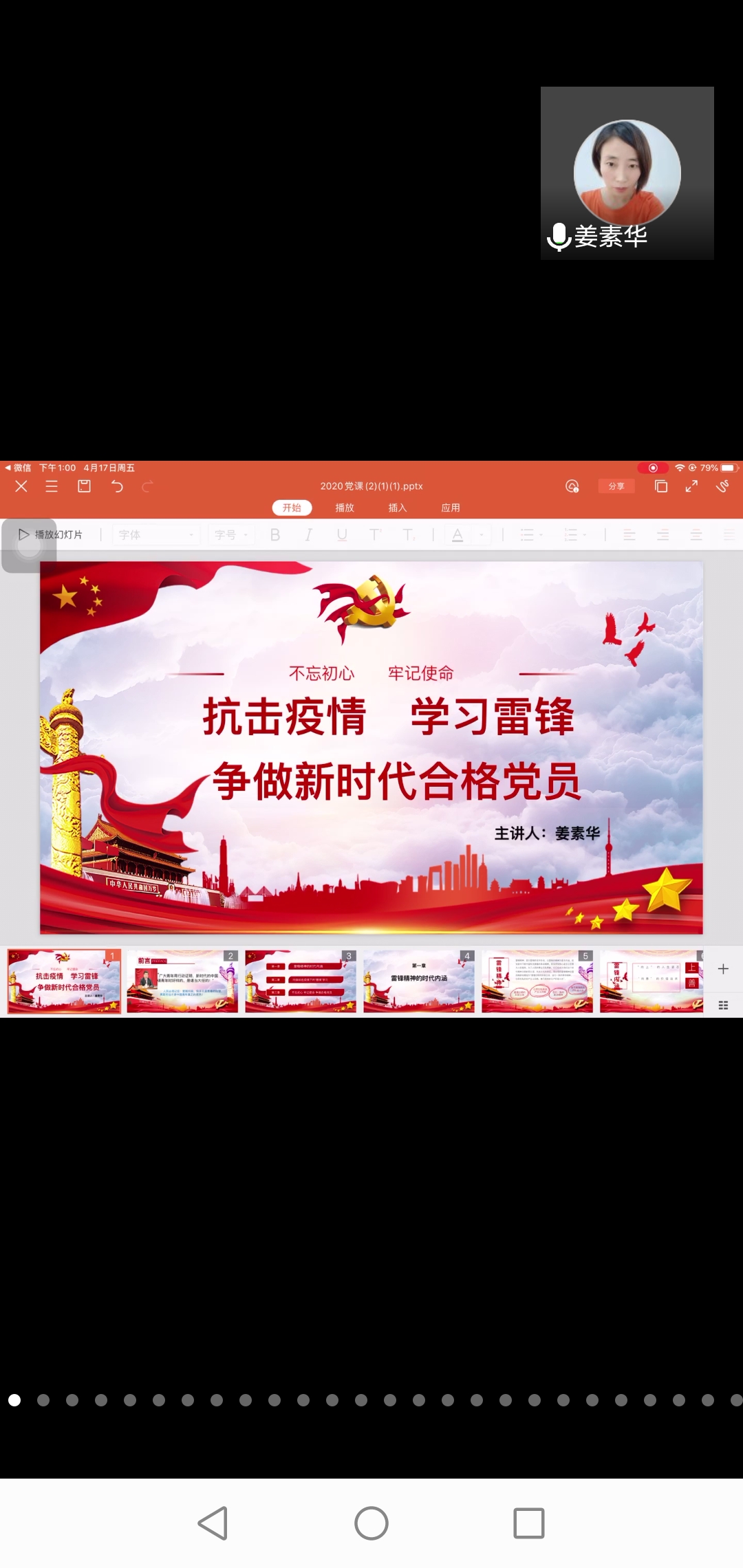 为进一步学习和弘扬雷锋精神,提高党员后备力量的素质修养。金年会jinnianhuicom于4月17日下午一点召开“抗击疫情,学习雷锋,争做新时代合格党员”主题线上党课培训。此次培训由全体中级入党积极分子参加,团总支书记姜素华主讲。