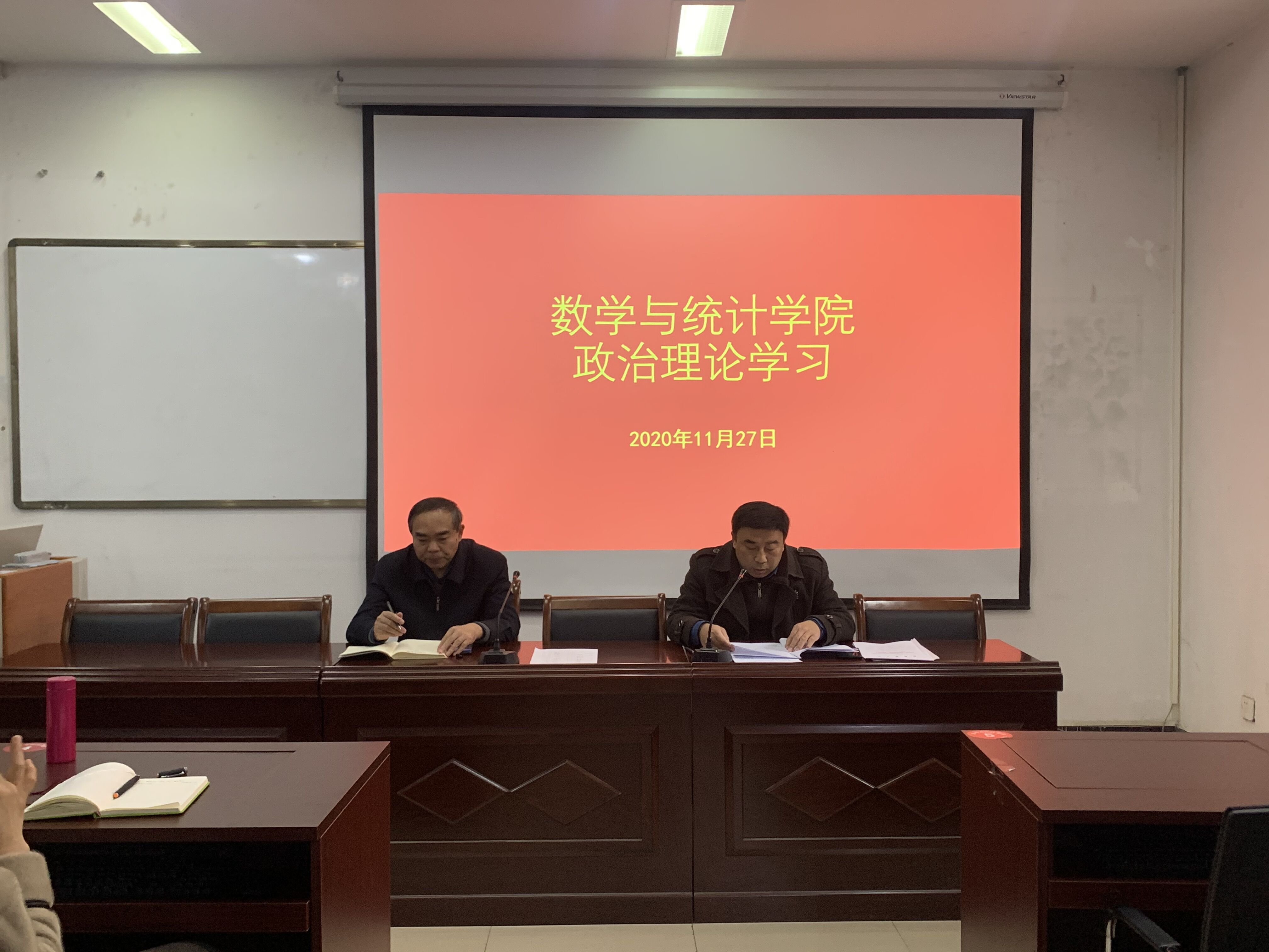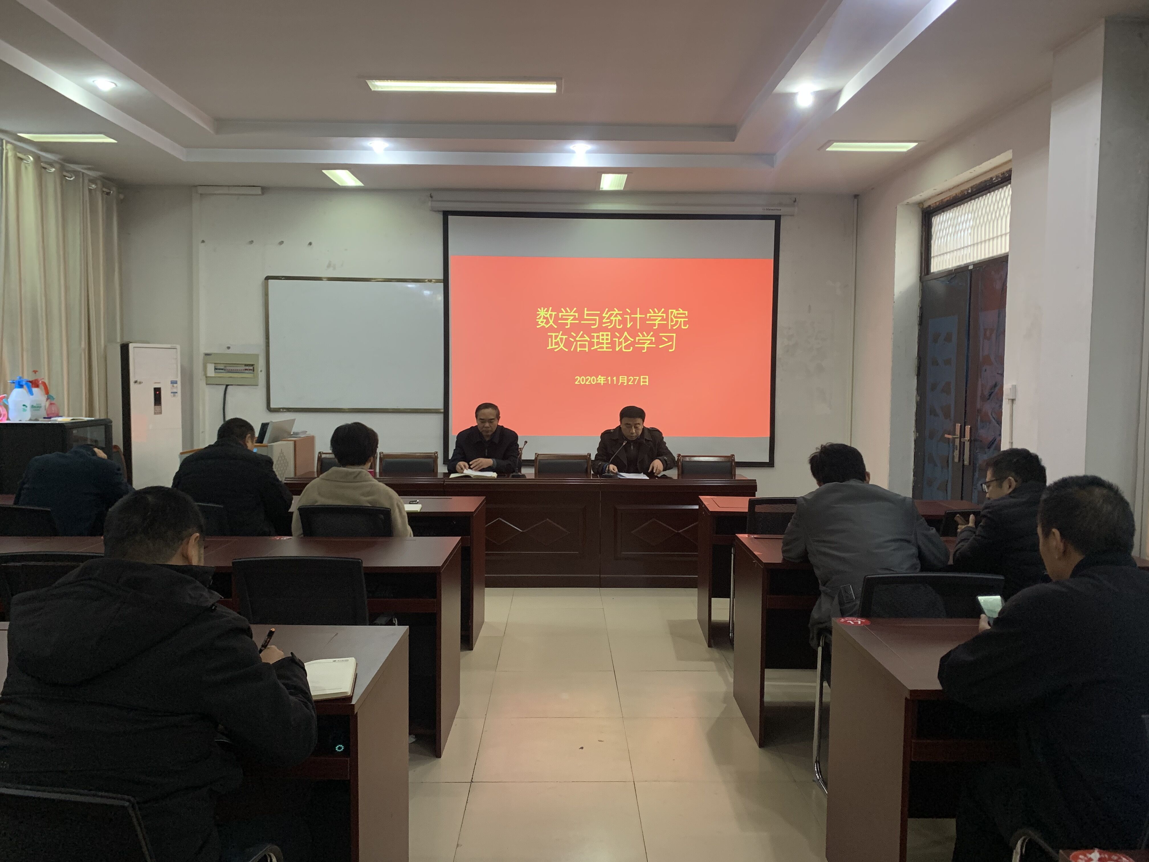 2020年11月27日下午,金年会jinnianhuicom在数学楼会议室召开政治理论学习会议,学院领导班子、全体教职工参加此次会议,会议由院长梁洪亮主持。