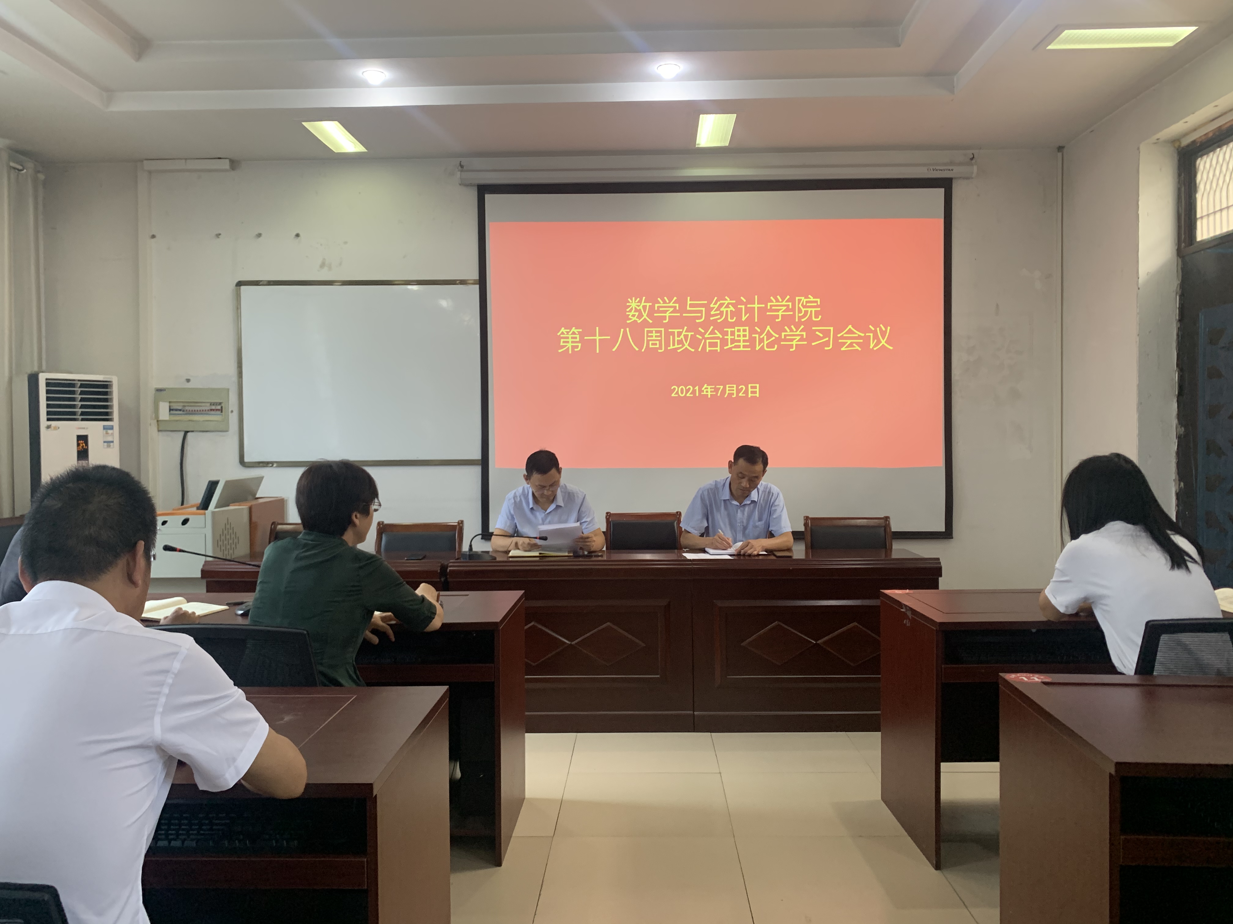 2021年7月2日,根据学校宣传部通知要求,金年会jinnianhuicom在数学楼综合会议室召开第十八周政治理论学习会议,学院领导班子、全体教职工参加此次会议,会议由党委书记孟学超主持。