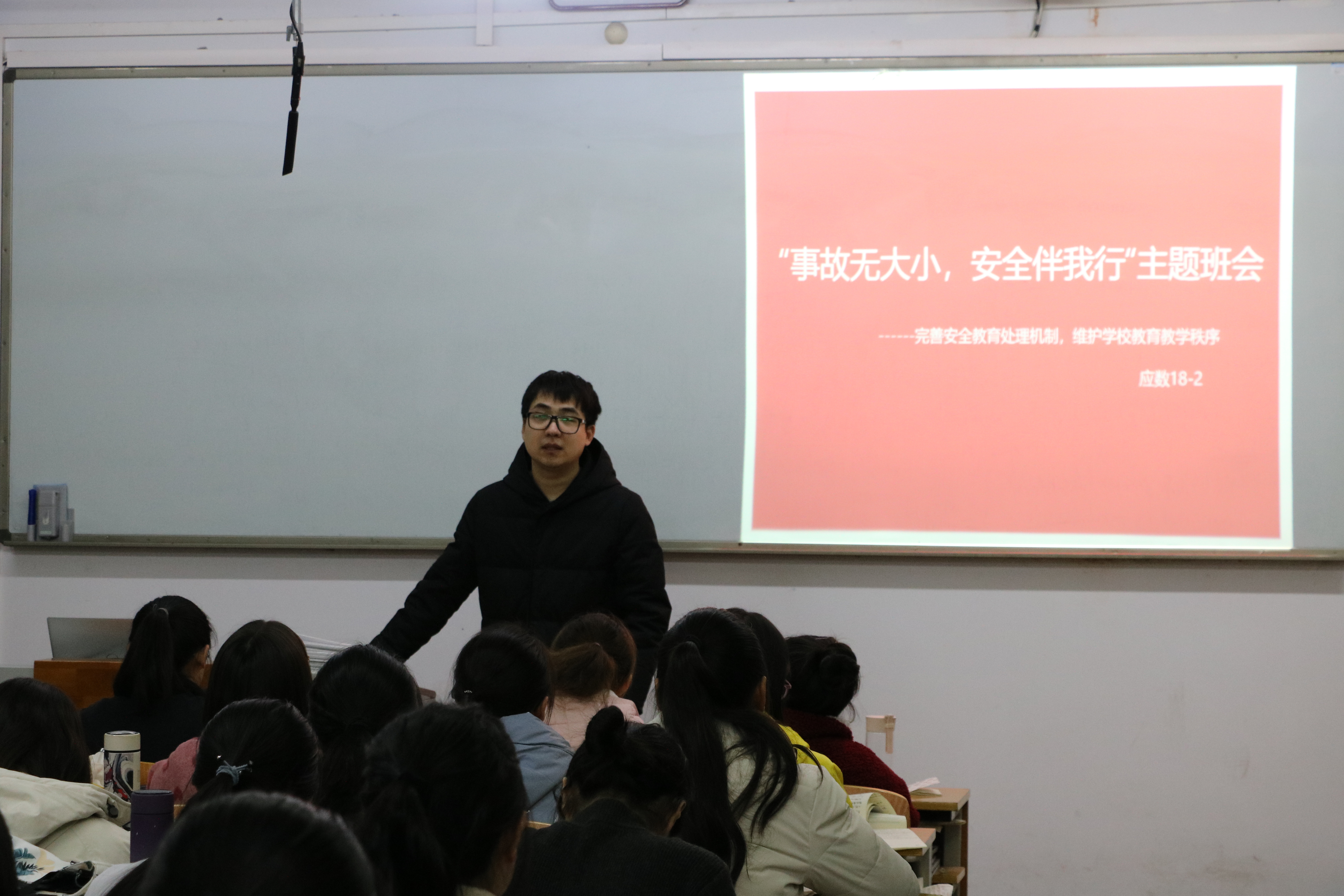 为增强同学们的安全防范意识,提高安全防范能力,全面普及校园安全常识。金年会jinnianhuicom于12月3日晚在一号教学楼“事故无大小,安全伴我行”和“共建和谐校园”等主题班会。此次班会由各班辅导员主持。