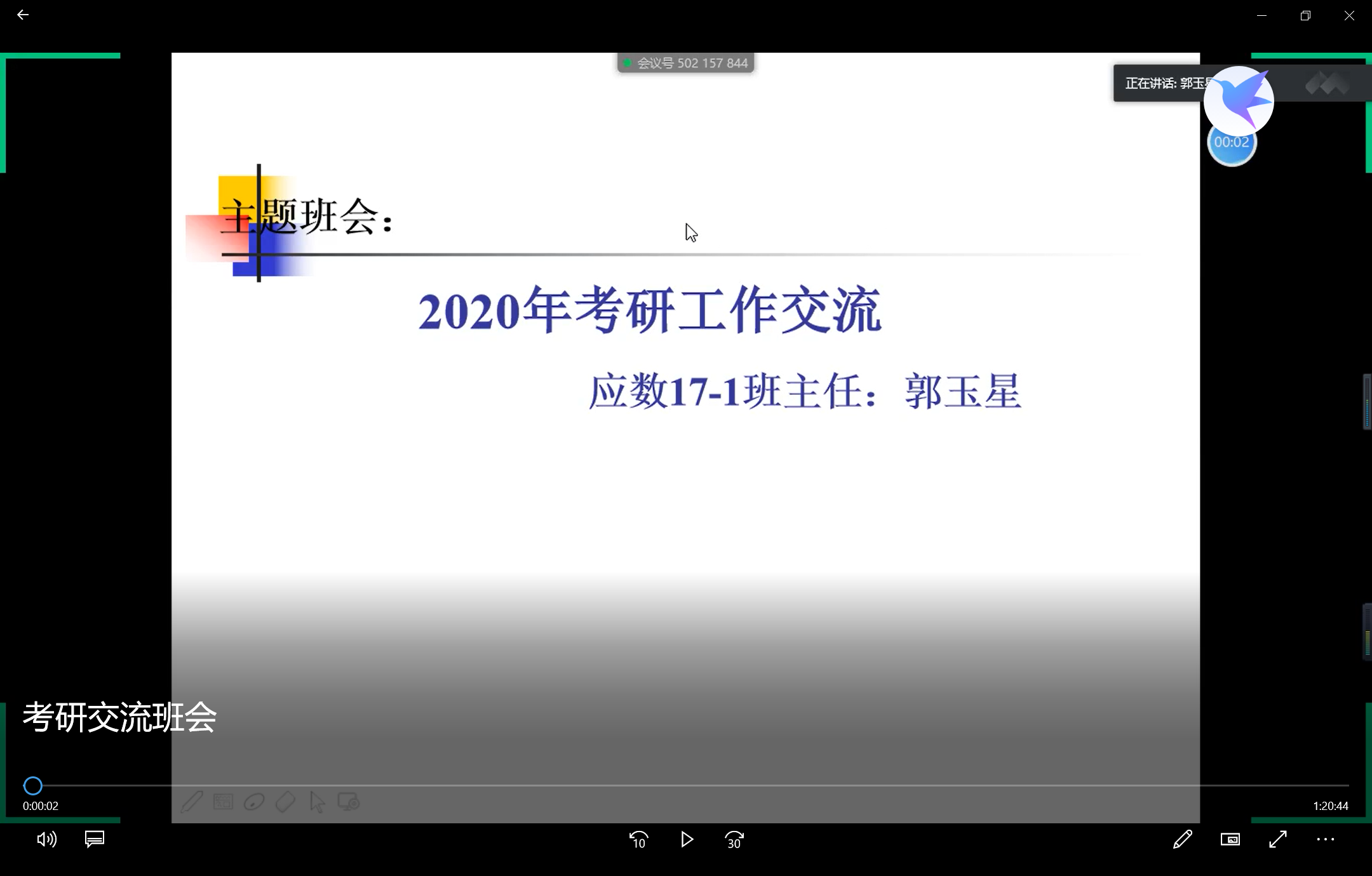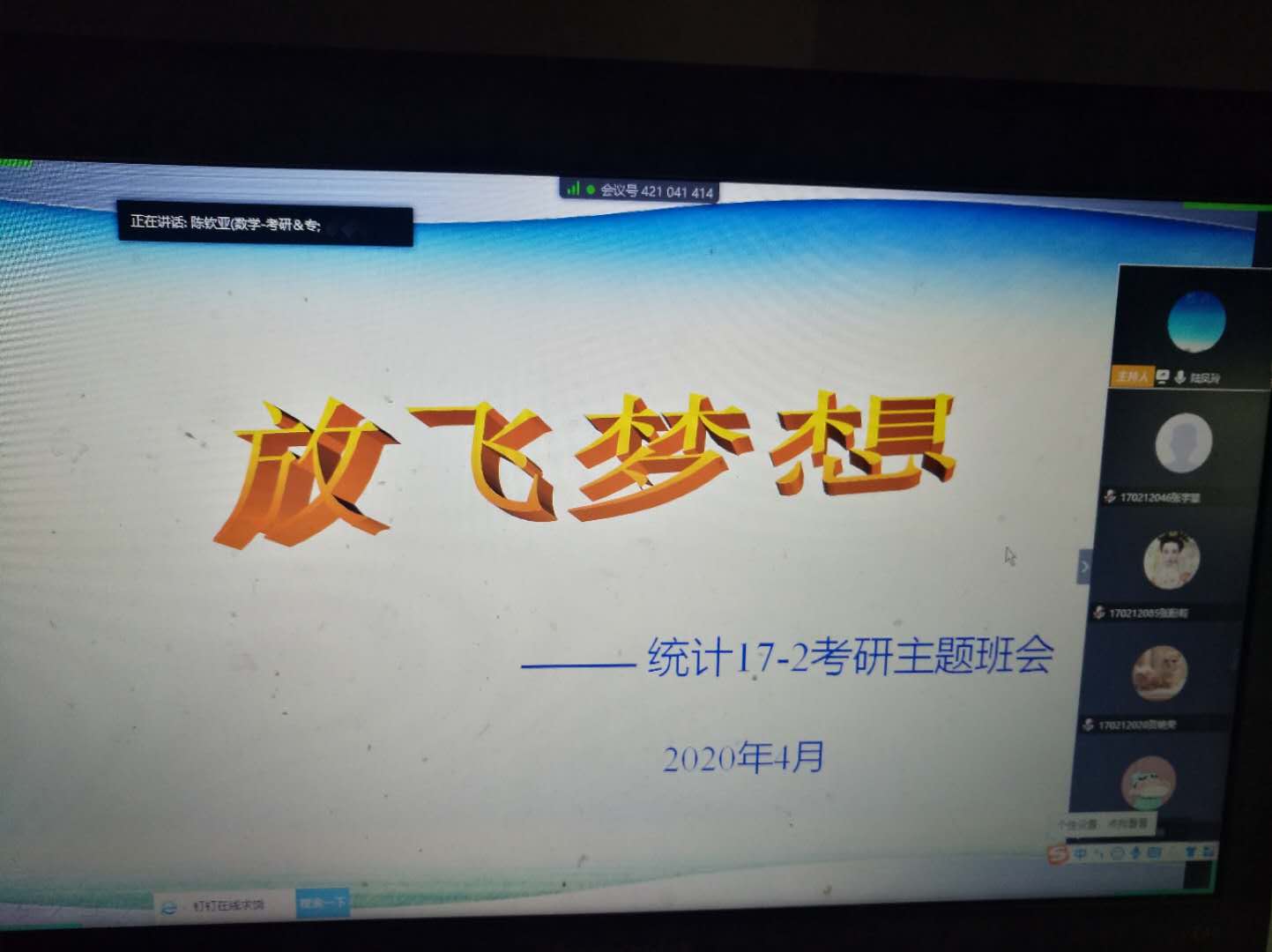 为了更好的帮助金年会学生规划学业生涯,明确努力方向,了解数学专业考研宏观形势及备考流程,金年会在3月底至4月初期间陆续为2017级应用数学、统计学专业学生开展了“放飞梦想”考研主题班会及问题答疑讲座,综合考虑到疫情给高校正常教学活动带来的影响,本次考研主题班会在线上进行。