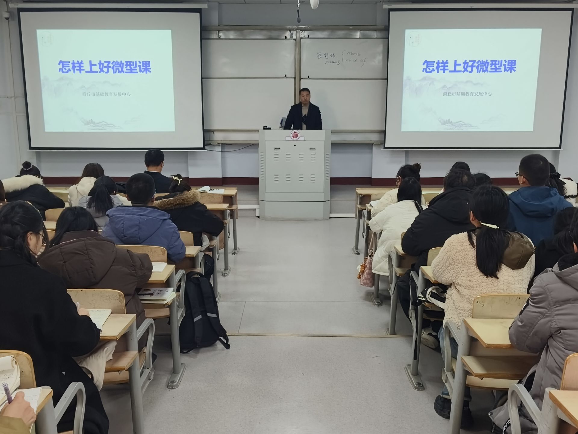 本次培训围绕微型课的定义、特点、用途及教学技巧等七个方面展开。培训开始,范兴达从微型课的“四精”原则入手,详细解读了其核心要求,并用“短、小、精、巧”四个字精准概括了微型课的特点,生动展示了微型课在实际教学中的应用及其重要性。接着,范兴达深入阐述了上好微型课的七个关键方面,强调“教学环节要齐全”和“课堂板书要简约”这两个重要原则。并通过“再探菱形”的案例,详细讲解了微型课与微课之间的主要区别,帮助同学们更加清晰地理解两者的不同。最后,范老师结合自身的教学经验,深入浅出地讲解如何讲好一节微型课的教学方法,让同学们受益匪浅,收获满满。