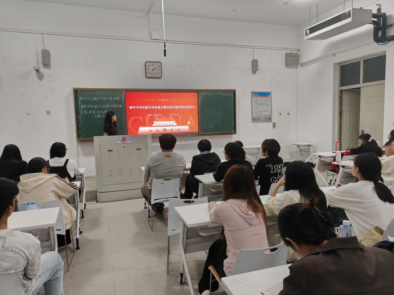 为深入贯彻落实中央、省委民族工作会议精神,引导广大青年学生牢固树立中华民族共同体理念,金年会jinnianhuicom于10月8日下午在梁园校区行方楼开展了“铸牢中华民族共同体意识暨民族宗教政策法规宣传”主题团日活动。