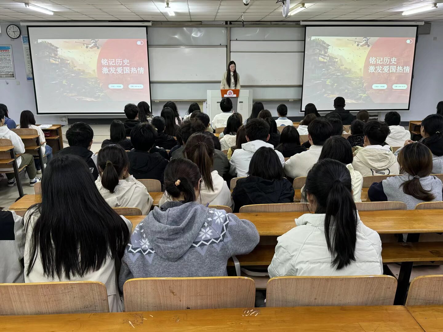 活动伊始,刘宝聪以“铭记民族历史的重要意义”为切入点,结合历史案例系统阐述,民族历史既能为国家发展提供经验教训,更能培育青年的爱国情怀与责任意识。随后,她围绕“弘扬爱国主义精神的现实路径”提出需从加强教育体系建设与用好红色资源两方面发力,呼吁同学们积极参与相关实践活动。最后,刘宝聪认为青年既要汲取历史智慧、坚持以人民为中心的理念,还要警惕历史周期率与关键领域的系统性风险,更要为学院发展和自身成长贡献青春力量。