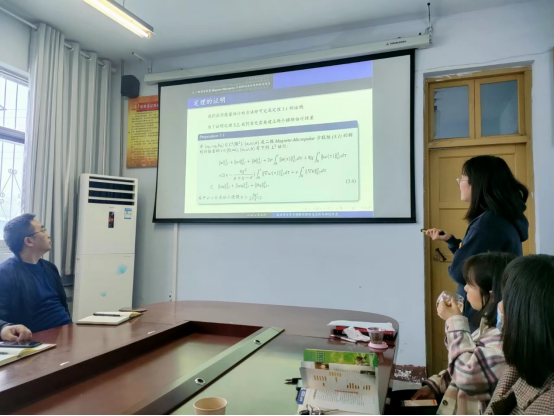 郭亚娜博士结合自己博士期间的相关研究成果,对三类不可压流体动力学方程进行了详细介绍,如“无角粘性的二维微极流体方程解的渐进性态”、“二维部分耗散磁微极流体方程解的存在性和渐近性态”以及“二维部分耗散MHD方程稳定解的存在性”。随后,各位参会教师与郭亚娜就相关问题进行了深入的讨论和交流。