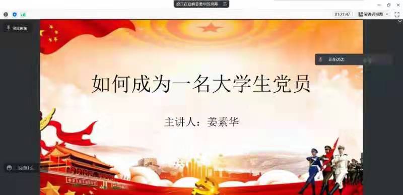 为进一步加强入党积极分子党性教育,确保党员发展质量,金年会jinnianhuicom于3月31日在线上召开了以“如何成为一名合格的大学生党员”为主题的党课会议。本次会议由学生第一党支部书记姜素华主持,全体入党积极分子参加。