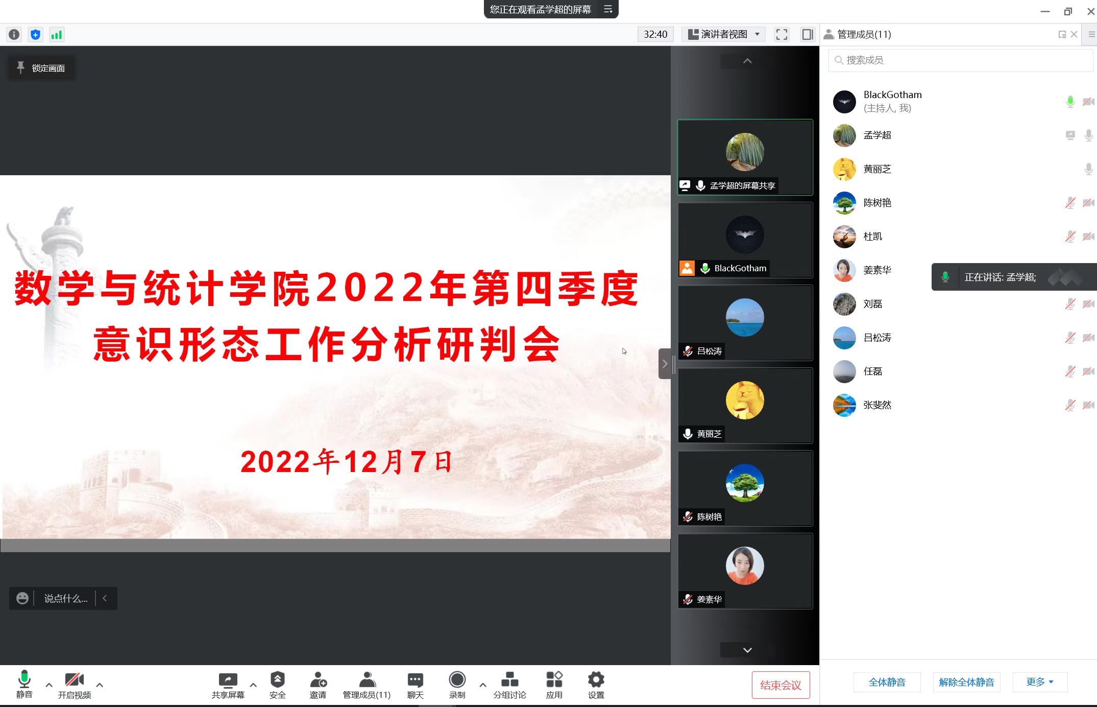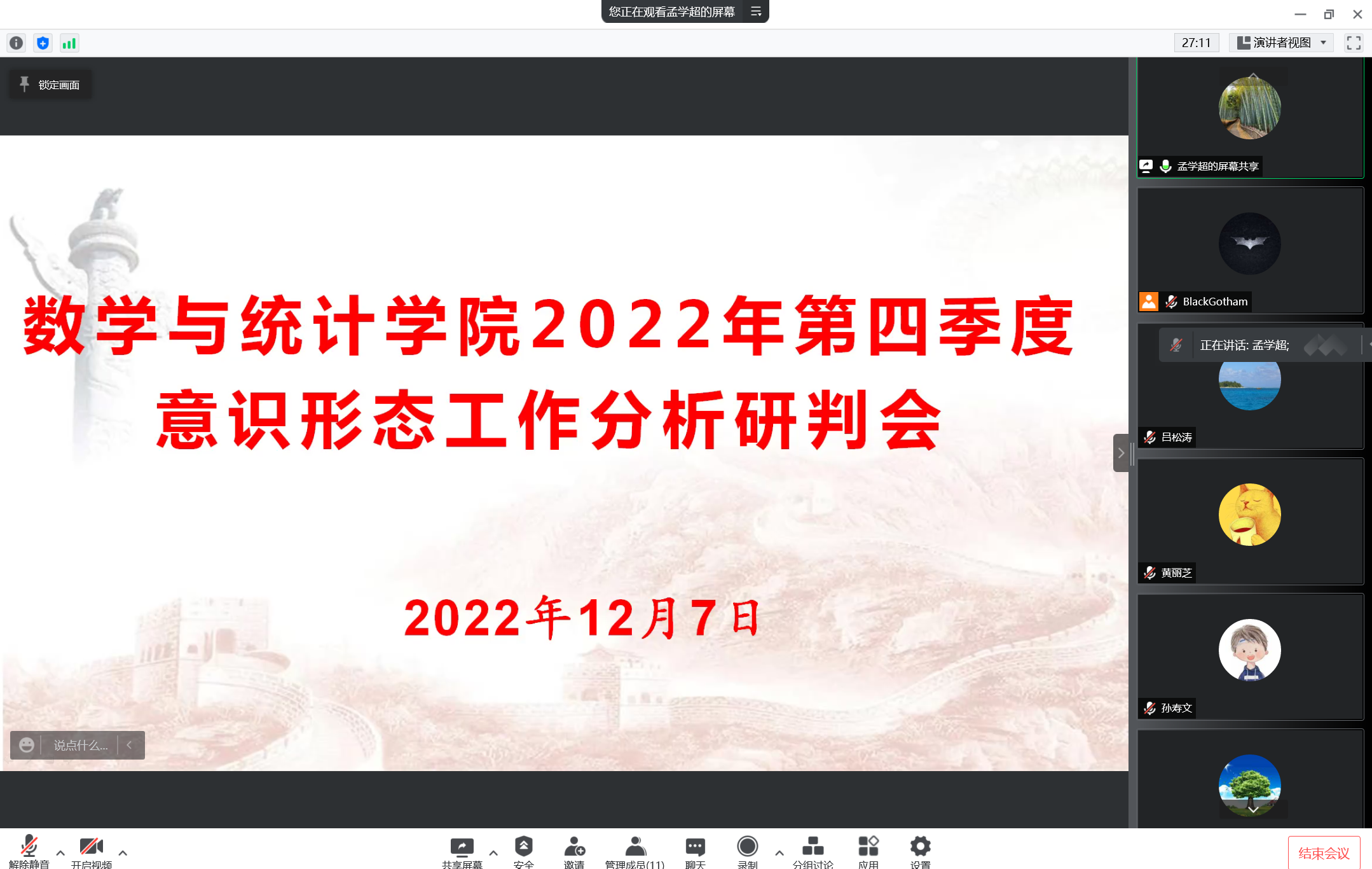 2022年12月7日上午,金年会jinnianhuicom通过腾讯会议召开2022年第四季度意识形态工作分析研判会,学院党委委员、党支部书记、全体辅导员参加了此次会议,会议由党委书记孟学超主持。