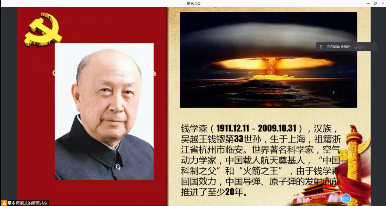 在本节党课中,黄老师首先讲到新时代大学生党员弘扬爱国奋斗的重要价值有哪些,激发本支部党员爱国主义情怀,在面对突如其来的疫情和灾情面前,敢于冲锋陷阵、不断努力向前,实现自己的人生价值。其次,黄老师讲了榜样的爱国奋斗历程,从上世纪三十年代的西南联大出来的邓稼先、于敏、黄大年等名人,到今天的黄莺、刘强等优秀青年,给大学生党员们做出了很好的榜样,也给学生们带来许多启示。黄老师最后说到,要正确认识机会与挑战的关系,挑战与机会并存,挑战孕育着机会,机会来源于挑战。