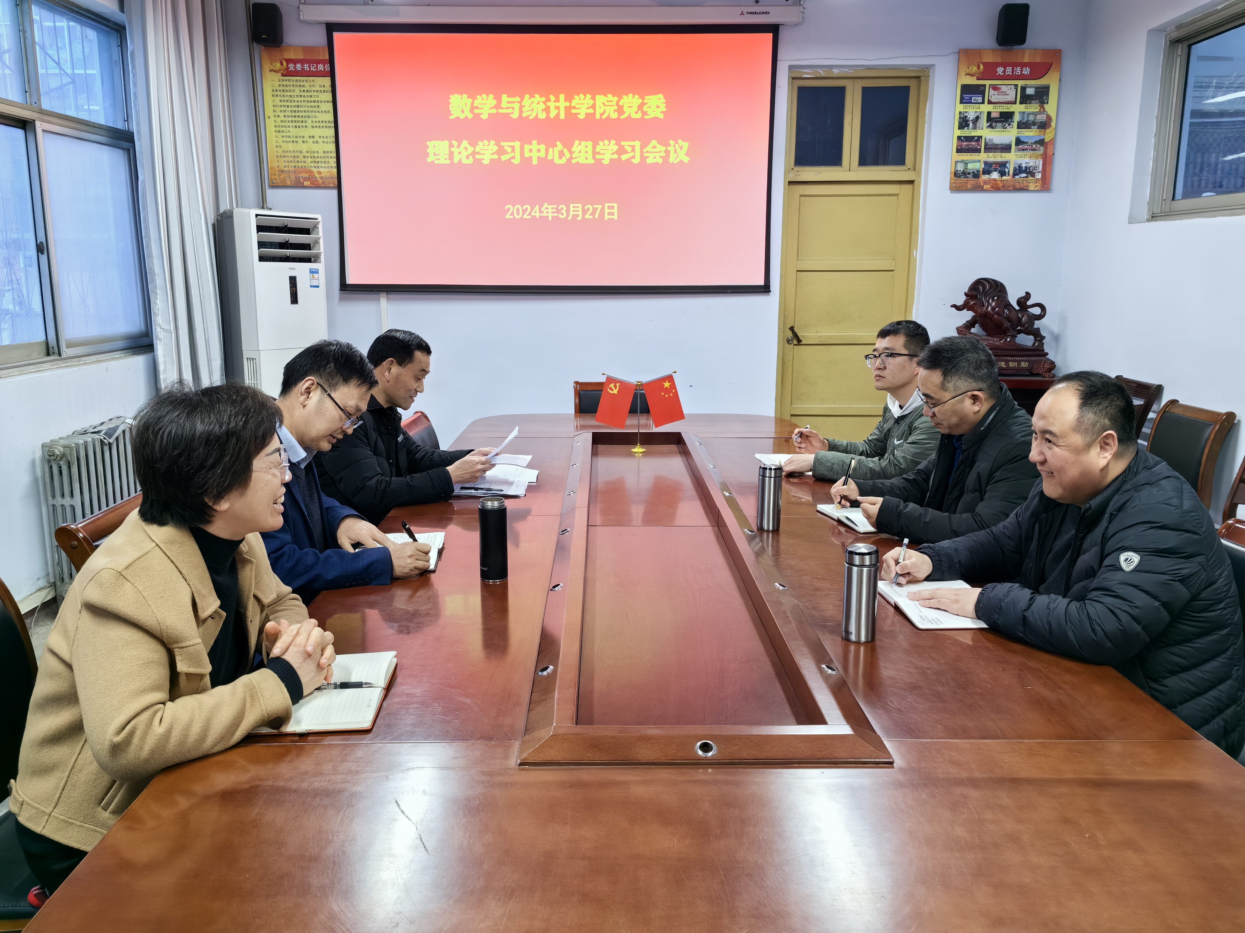 2024年3月27日,金年会jinnianhuicom在数学楼204党员活动室召开党委理论学习中心组会议,学院党委委员参加了此次会议。会议由学院党委书记孟学超主持。