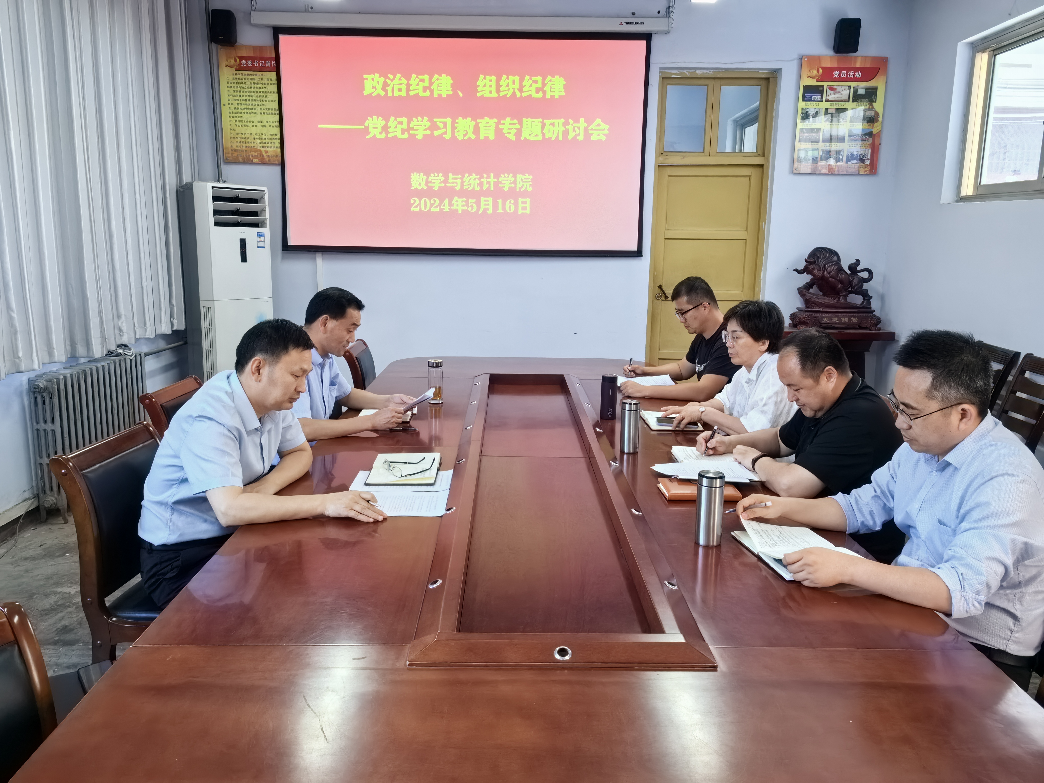 2024年5月16日,金年会jinnianhuicom党委理论学习中心组在数学楼204党员活动室举行党纪学习教育第一次专题学习研讨会,学院党委委员参加会议。会议由学院党委书记孟学超主持。