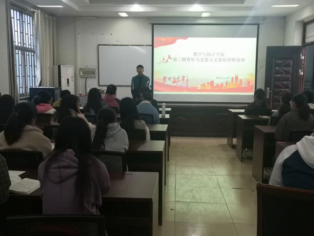 为提升青马班学员思想政治素养,深入学习贯彻习近平新时代中国特色社会主义思想和党的十九大精神。金年会jinnianhuicom于11月23日上午8:30在办公楼208教室进行第二期青年马克思主义者培训班培训。本次培训由学生兼职团总支副书记高乐主讲,全体青马班学员参加。