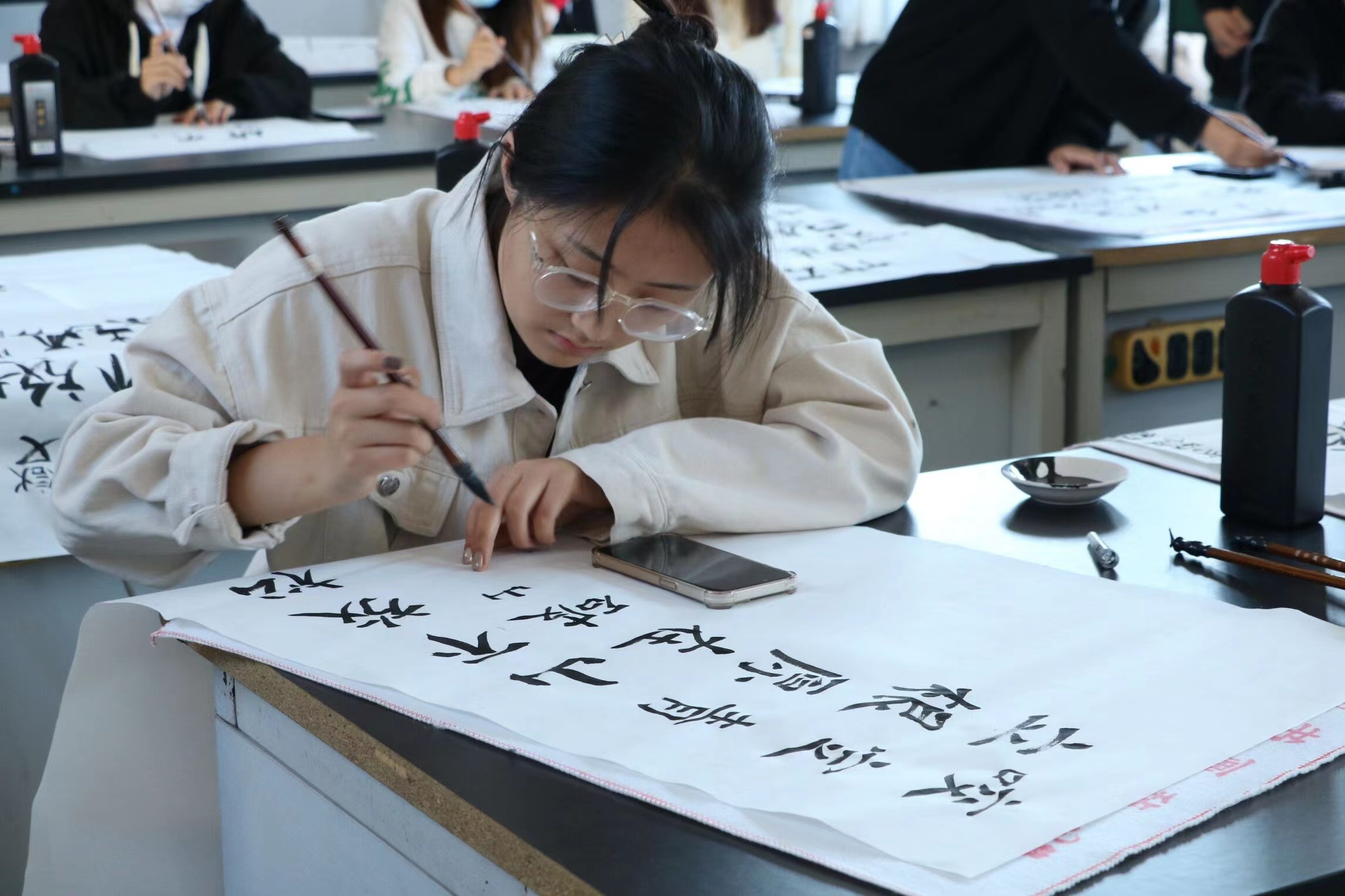 大赛依次进行了粉笔字、钢笔字和毛笔字三个项目。为确保比赛公平、公正地进行,大赛书写材料在比赛开始时公布,所有参赛作品均在现场完成。比赛过程中,参赛选手沉着冷静,挥毫笔墨,用心书写每一个笔画、每一个汉字,展现了良好的书写功底和专业素养,作品笔画流畅,布局协调统一,现场洋溢着笔墨之香。无论是清秀工整的粉笔字,还是苍劲隽美的钢笔字,抑或是遒劲流畅的毛笔字,都在参赛者们的笔下生花。参赛者也在比赛中感受着中国传统书法艺术的博大精深,既陶冶了情操,又平和了心境。