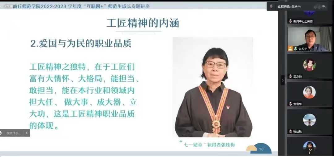 此次培训以“互联网+”师范生成长为专题,由张永平老师做《工匠精神与教师专业素养》主题讲座,围绕“教师需要工匠精神”、“爱岗敬业,塑造一颗匠心”、“专注教育,练就一身匠气”及“虚心向学,成就教育工匠”四方面展开。首先,张永平老师详细讲解了工匠精神的内涵与本质,通过列举张桂梅、于漪和霍懋征等多位优秀教育工作者的例子,提出教师需要工匠精神的观点。随后,张老师介绍了匠心的内涵及外在表现和匠者的“傻气”与“呆气”,并分享了多种常见的教学方法,要求学员们在日后的教育工作中做到爱岗敬业、精益求精、严谨治学、痴心从教、埋头苦干以及执着专研,塑造师者匠心,练就一身匠气。最后,张永平老师讲述了匠者独活的启示,同时以身边多个优秀名师为例,激励学员们专注于心、深度学习、虚心向学,成就教育工匠。