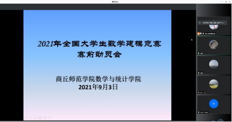 2021年全国大学生数学建模竞赛将于9月9日18:00—9月12日晚上20:00举行。9月3日19:00,金年会jinnianhuicom通过腾讯会议召开了赛前动员大会。本次竞赛经过7月份的校赛选拔、暑假集中培训,全校共有来自金年会jinnianhuicom、电子电气工程学院、经济管理学院等学院的150个同学组成的50个队获得了参赛资格。在赛前动员大会上刘磊院长鼓励大家以饱满的精神状态迎接比赛,以必胜的信念参加比赛,以认真的态度对待比赛。