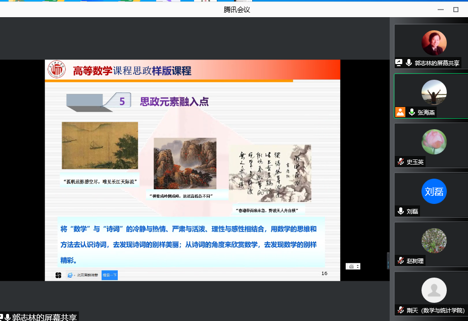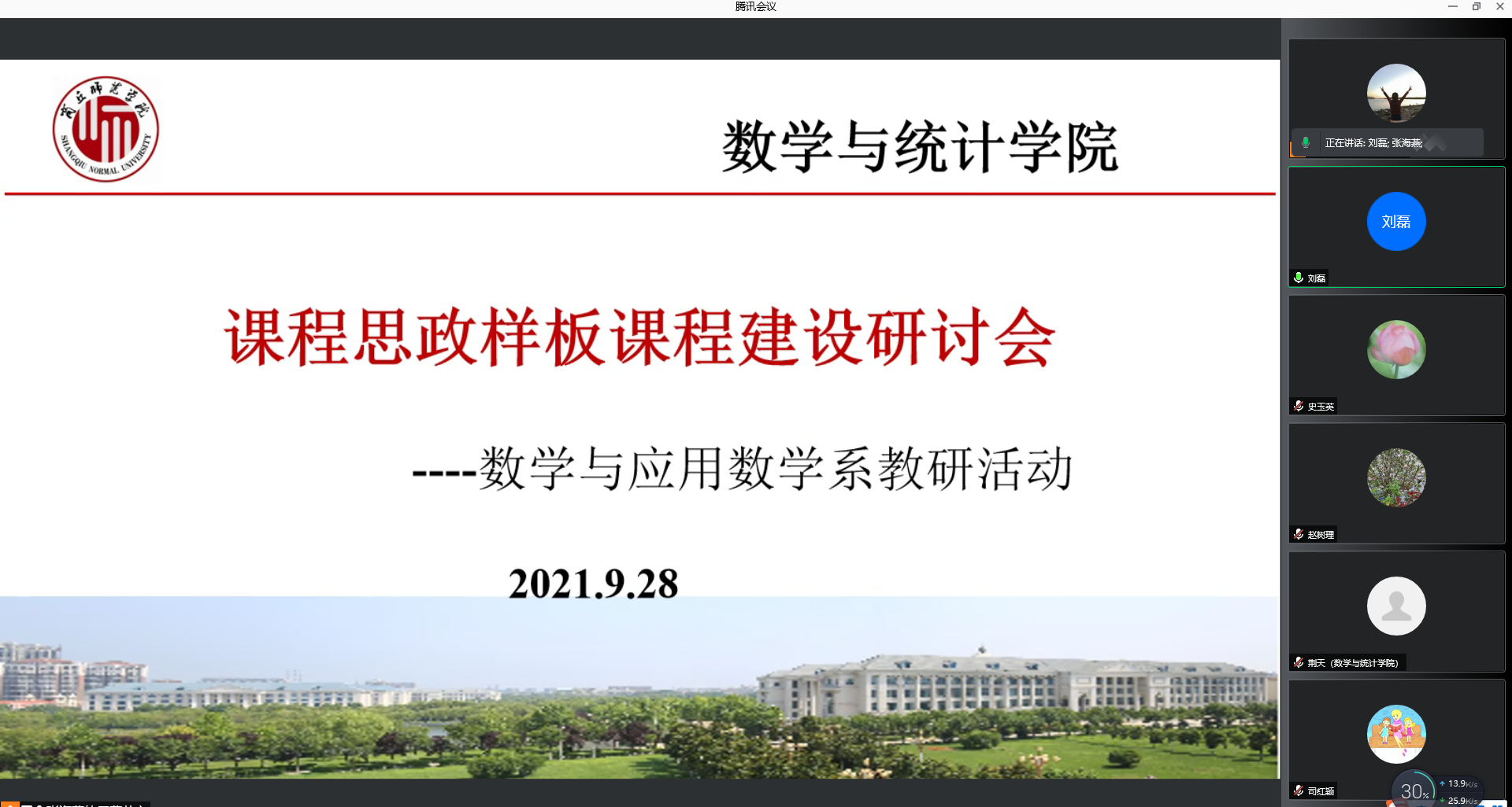 9月28日晚,金年会jinnianhuicom数学与应用数学系通过腾讯会议召开了本学期第二次教学研讨会,此次会议的主题为课程思政样板课程建设,会议由系主任张海燕主持,系全体教师参加会议。