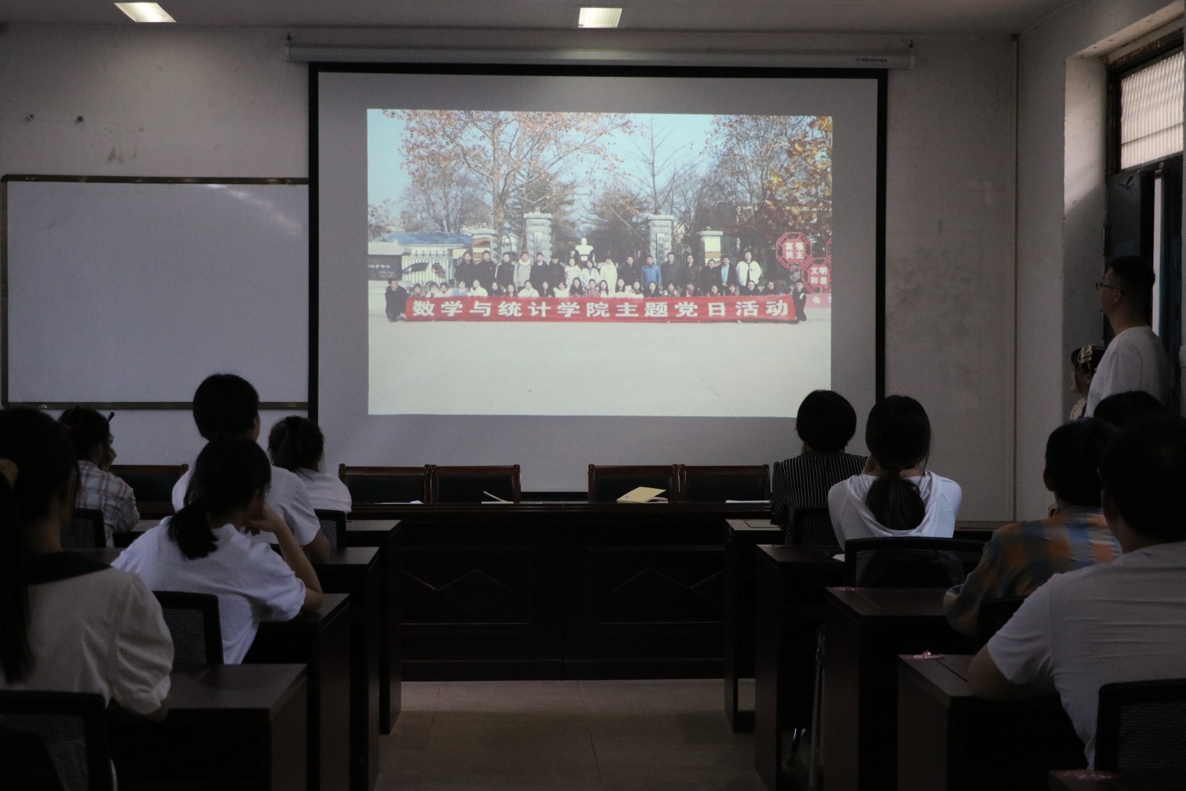 活动开始,全体党员观看“回顾百年党史,重温峥嵘岁月”视频,该视频由党员们讲述中国共产党历史上的伟大思想与重要举措,并说明对此的看法与启发。视频结尾,全体党员一起唱响《我和我的祖国》,歌声嘹亮,情感充沛,表达出对祖国的无限热爱。最后,全体党员在数学办公楼楼前进行了党词的宣誓,由第一党支部组织委员周芳园领誓,党旗鲜艳,声音洪亮,语气铿锵,充分展现出身为党员的精神面貌和高昂志气。