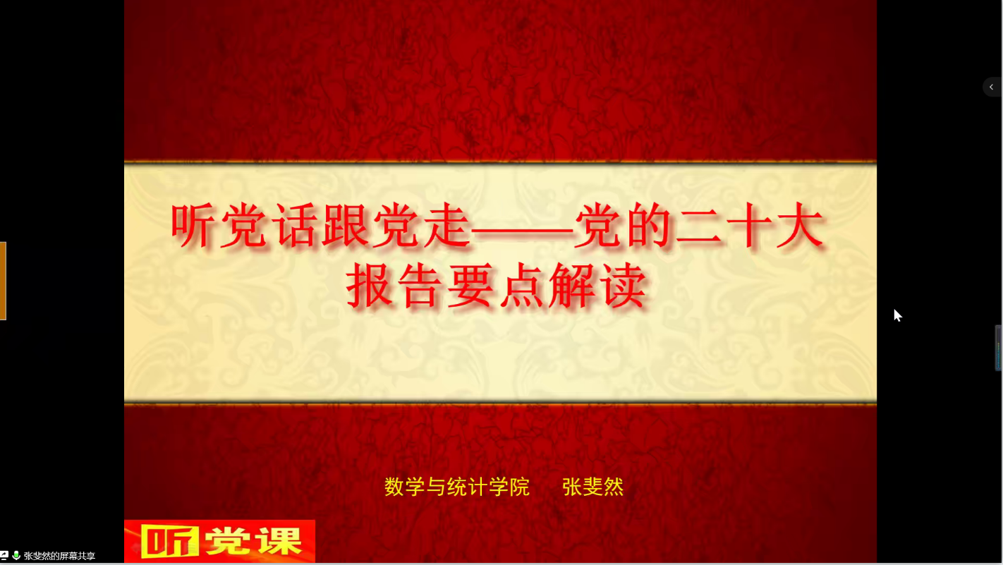 此次党课培训张斐然主要围绕党的二十大报告中的十五个要点开展。首先,张斐然院列举并阐述了新时代十年来党和国家事业取得的历史性成就、历史性变革以及中国式现代化的要求及原则。随后,通过列举孔子学院建设的例子,倡导同学们弘扬中华文明,加强文化自信,此外还以数学专业就业问题为例,着重对“就业优先战略”展开分析,为学生提供就业指导,希望青年学生树立科学的远大目标并及时制定为实现目标可操作的合理规划。最后,张斐然强调了作为青年学生要珍惜大学时光,认真学习科学文化知识,锤炼意志品格,用习近平新时代中国特色社会主义思想武装头脑,指导实践。